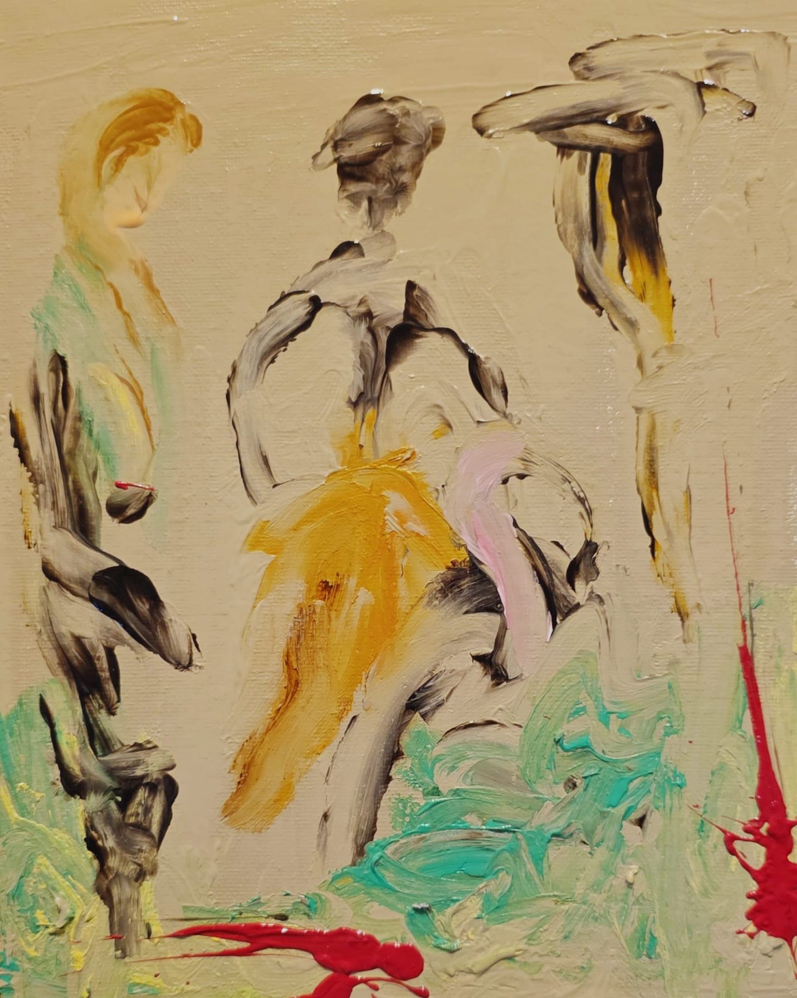 Through minimal facial detail and raw color contrasts, the painting transforms a simple moment of movement into a symbolic encounter between the earthly and the divine.
