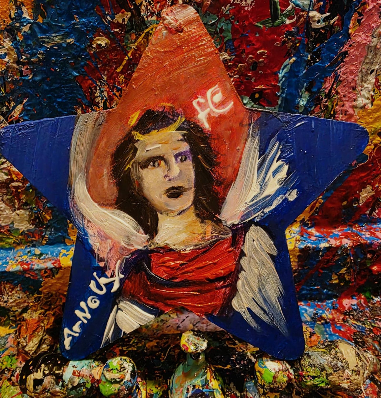 The use of wood as a shaped support reinforces the idea of incarnation: faith taking form within matter. This is not a distant or abstract spirituality, but one that is tangible, held, and carried. The handwritten presence of “ArNoUx” integrates authorship into the sacred object, merging identity and devotion.