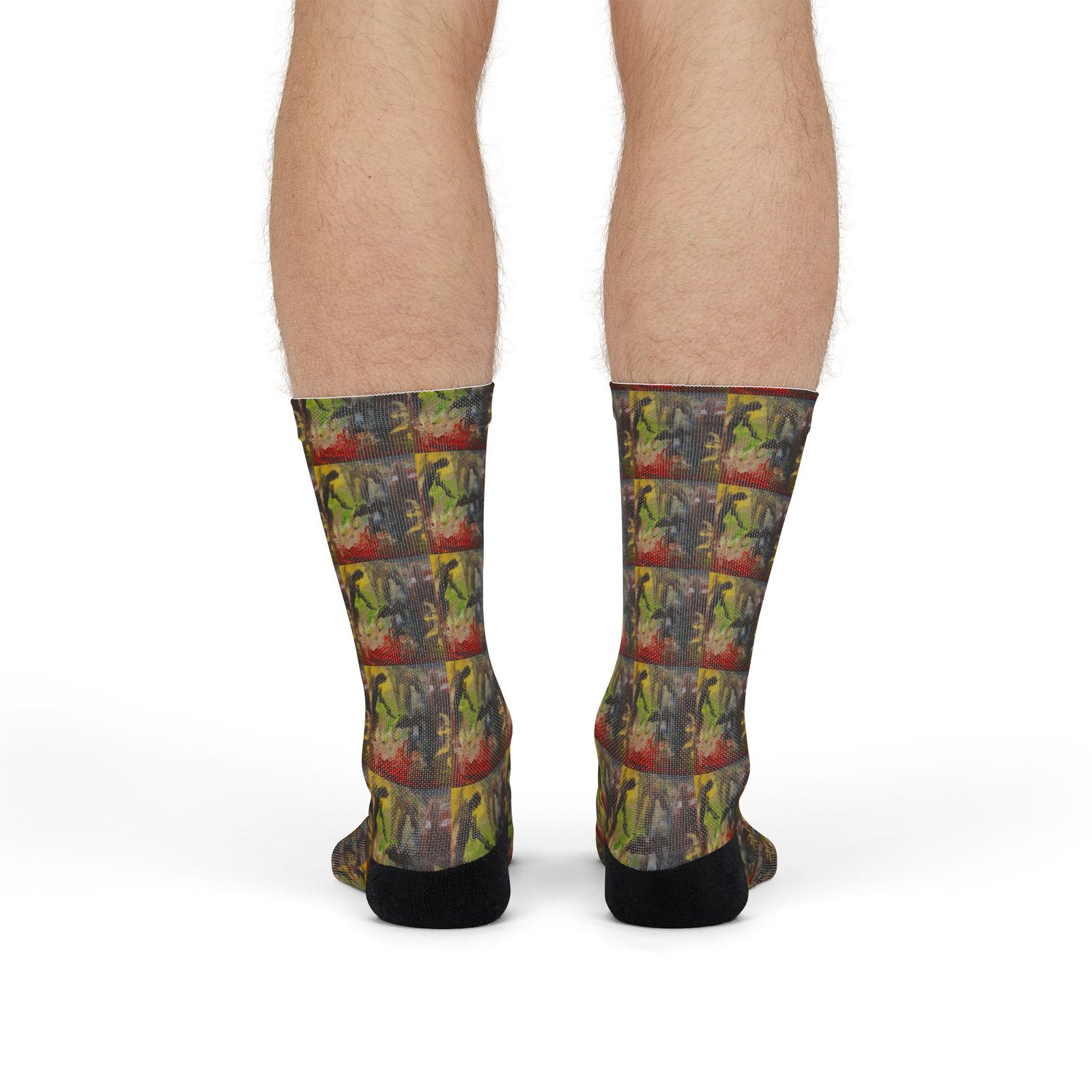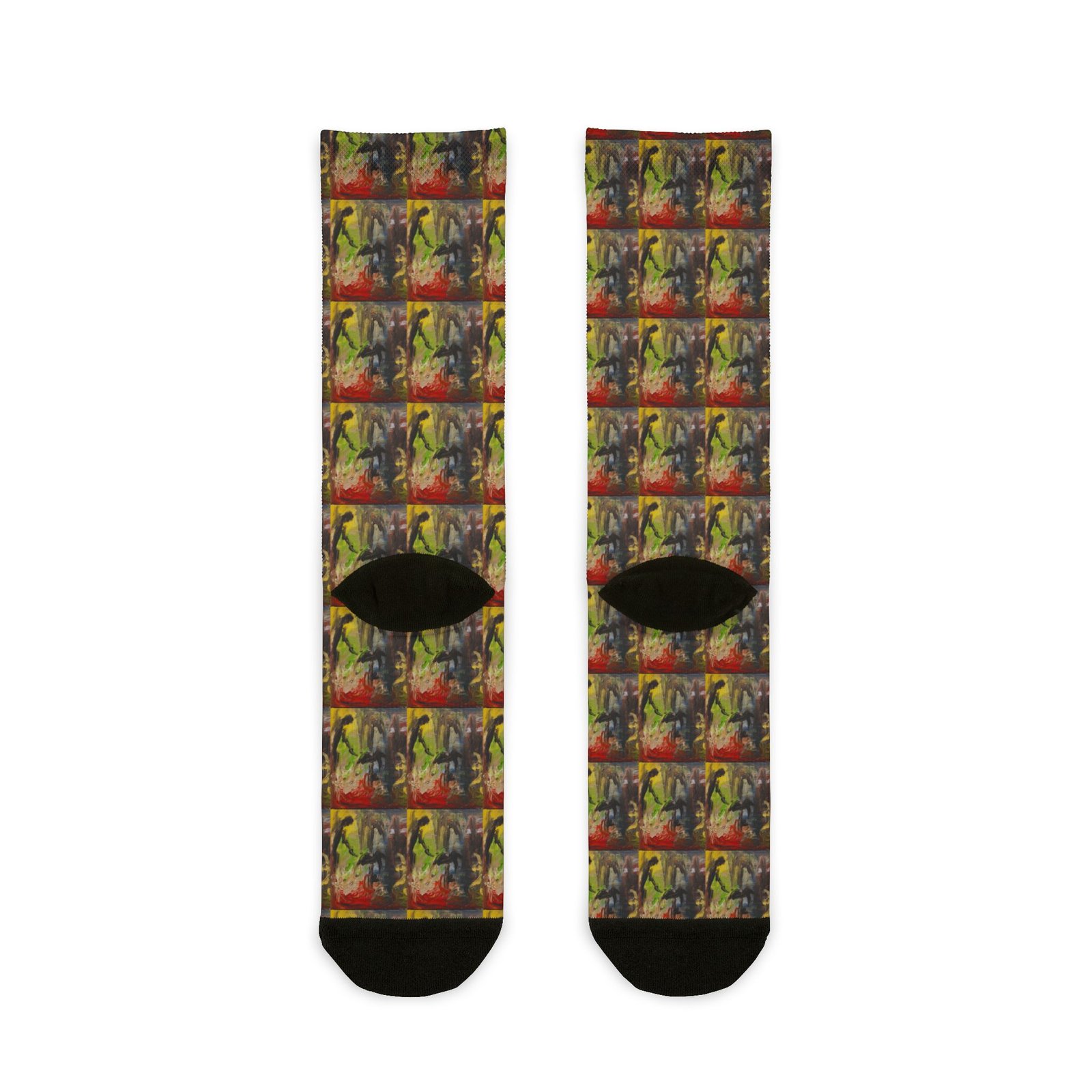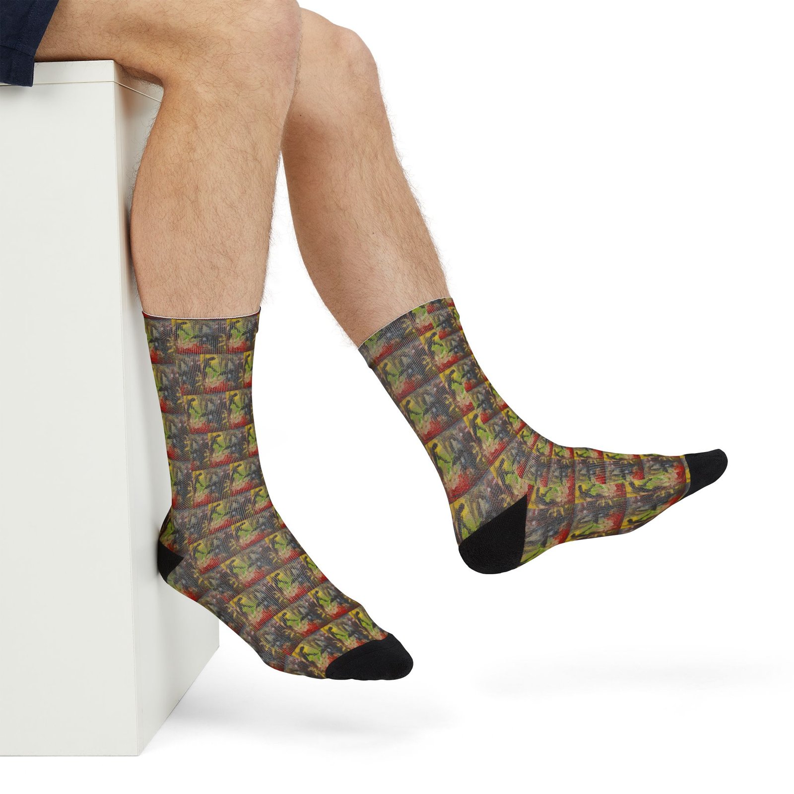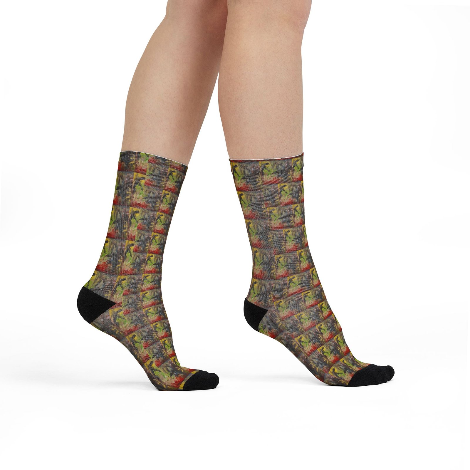 These crew socks bring bold, painterly energy to every step. The abstract, layered print reads like a pocket-sized canvas—warm ochres and deep crimsons collide with shadowed greens and charcoal strokes. Slip them on to add a splash of artful chaos to a quiet outfit or to anchor a creative morning routine. They sit mid-calf with a cushioned weave that keeps the pattern vivid while the black heels and toes hide everyday wear. Lightweight and quick-drying, they feel like a soft second layer between you and whatever the day demands.