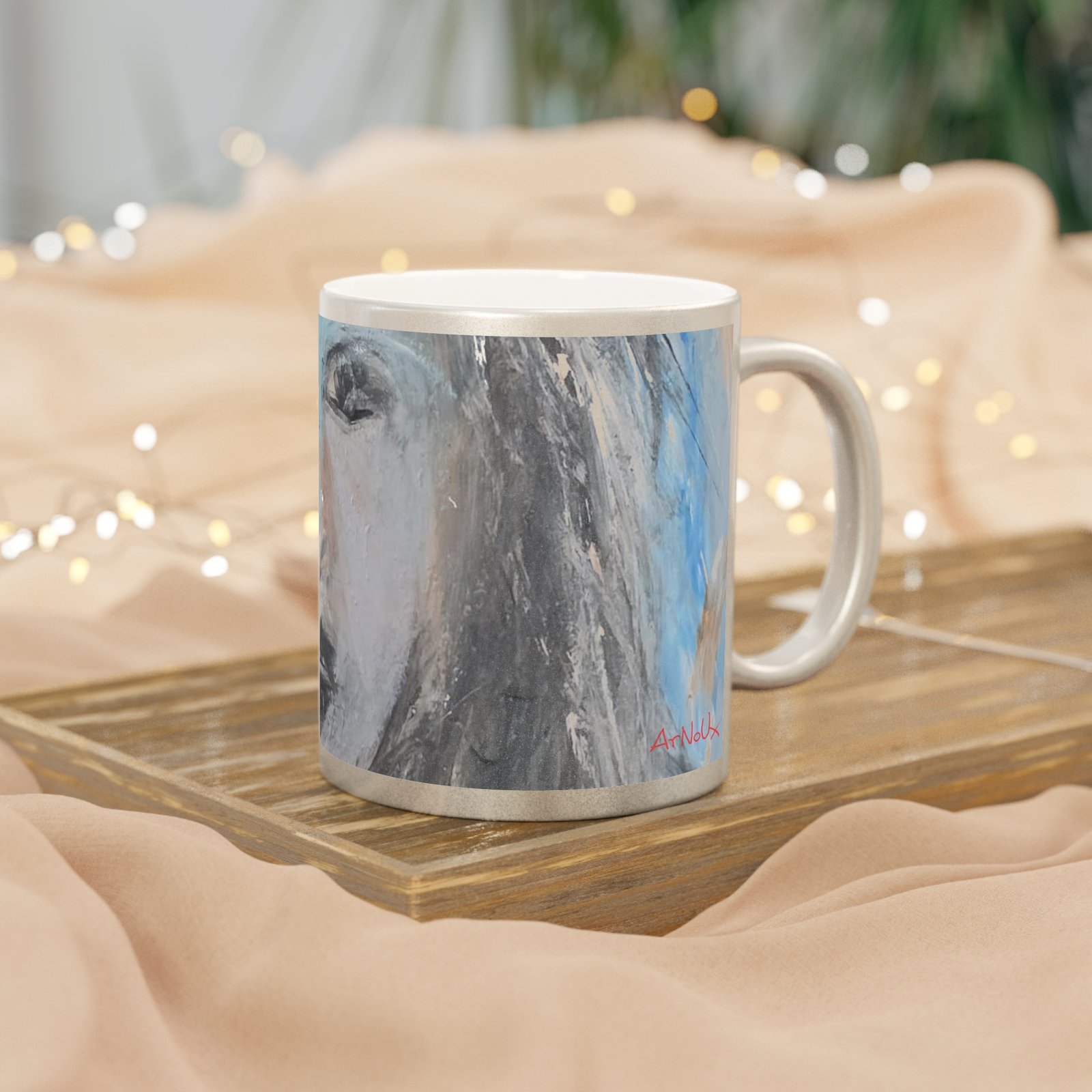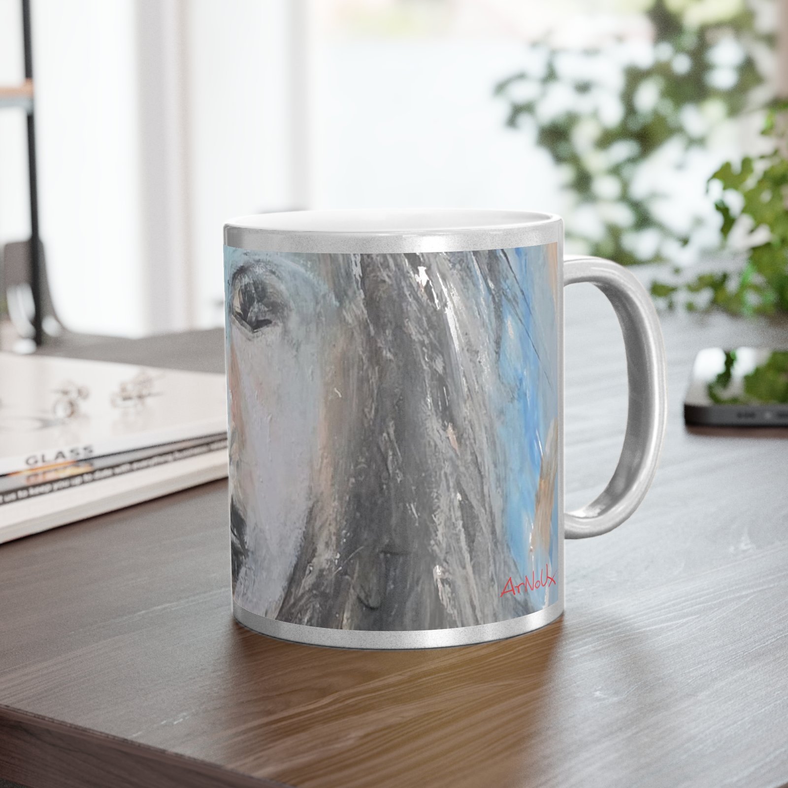 This metallic mug turns morning coffee into a quiet, reflective moment. The muted, painterly portrait wraps the 11oz ceramic surface in soft blues and grays, giving the piece an art-studio feel. A subtle silver (or warm gold) metallic coating catches light around the rim and handle, lending a gallery-ready shimmer without overpowering the artwork. It’s lightweight to hold with a comfortable C-handle and crafted without BPA, lead, or cadmium. Because of the metallic finish and delicate transfer, wash gently by hand and expect lighter design colors to come through with a slightly translucent, layered effect. Keep this mug on your desk or shelf as a small statement — something that invites a slow sip and a second look.