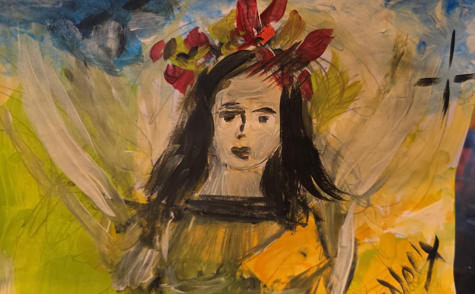 Angel of Praises emerges from ArNoUx’s German Expressionist vision — a poetic celebration of divine joy and gratitude. Painted on paper with luminous acrylics, the composition reveals a celestial being crowned with crimson petals, symbolizing the offering of praise that rises toward heaven.