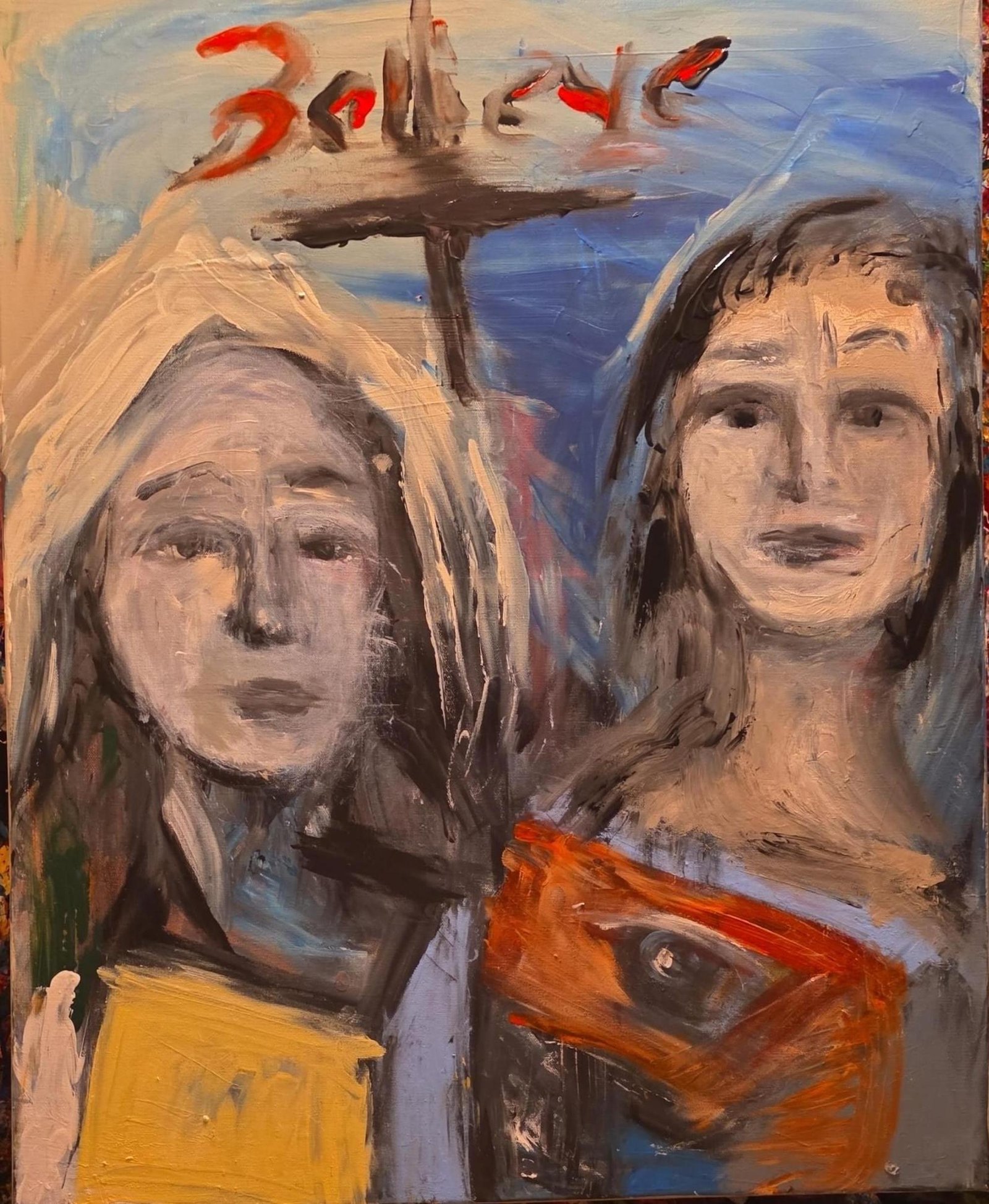 Angel of the Resurrection Announcement presents two solemn angelic figures bearing witness to the most transformative moment in Christian faith: the resurrection of Jesus Christ. Rendered through expressive, raw brushwork and restrained figuration, the composition emphasizes spiritual truth over anatomical precision.