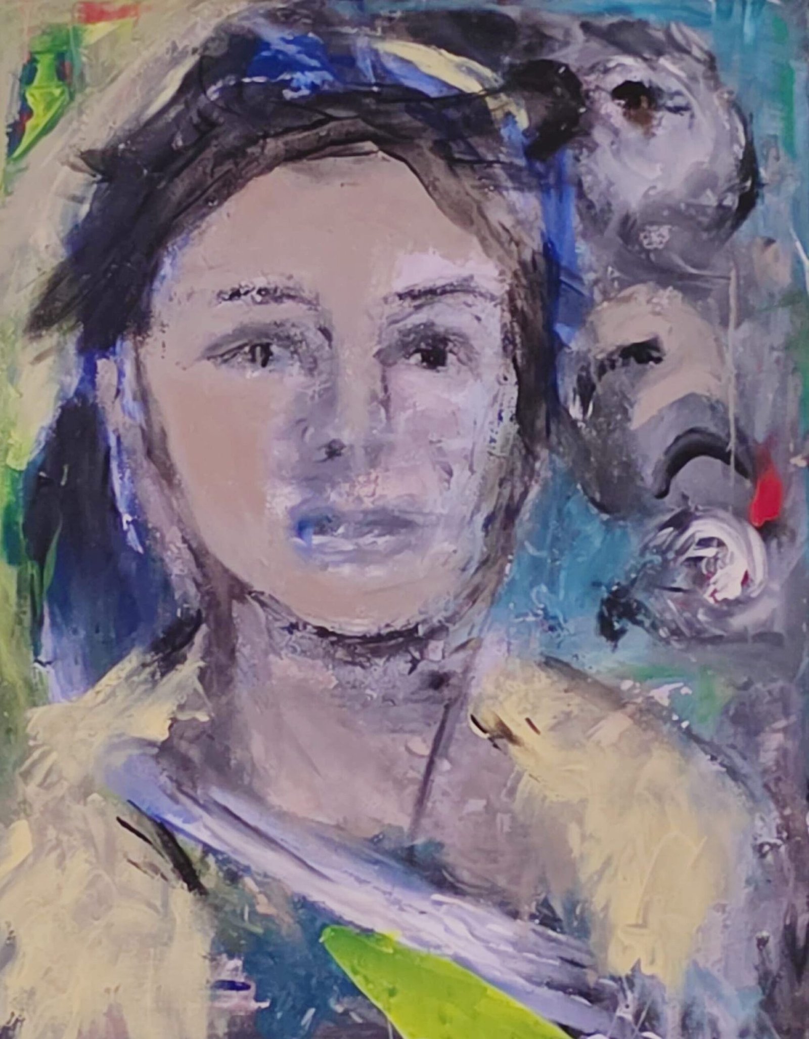 The central figure, a woman suspended between stillness and awareness, carries the quiet gravity of lived experience. Her gaze does not confront the viewer directly; instead, it drifts—suggesting memory, endurance, and an internal dialogue that transcends the physical plane. Around her, the angel does not appear as wings or light, but as a shifting presence embedded in the surrounding textures: abstracted forms, almost animalistic, almost human, emerging and dissolving into the background.