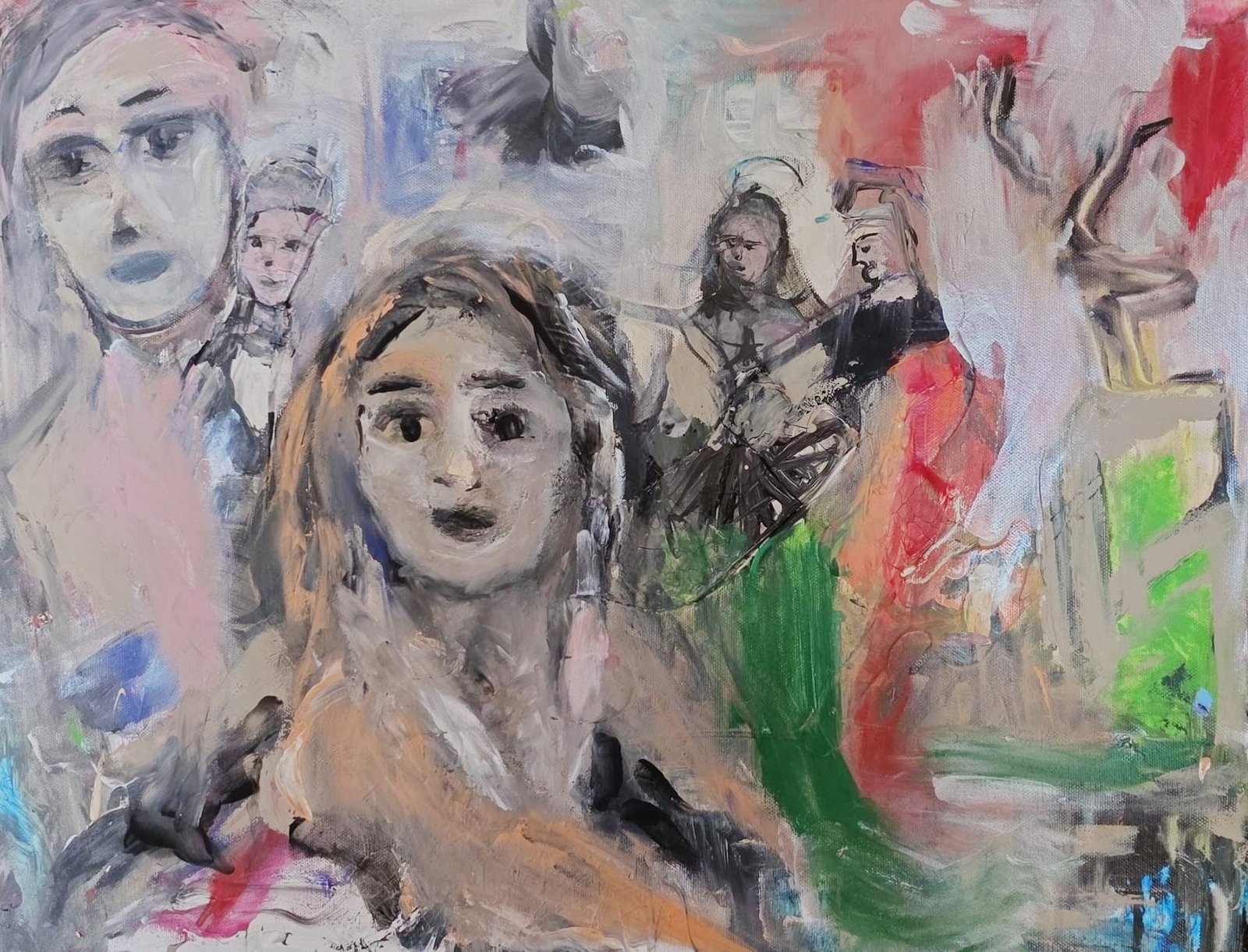 The central figure anchors the work: a human face rendered with emotional immediacy, wide-eyed and receptive. This figure does not resist the unseen; instead, it becomes a vessel of awareness. Around it, angels materialize in varying scales and degrees of abstraction, descending into the earthly plane. Their forms are not fully resolved, reinforcing their metaphysical nature—beings in passage between realms.