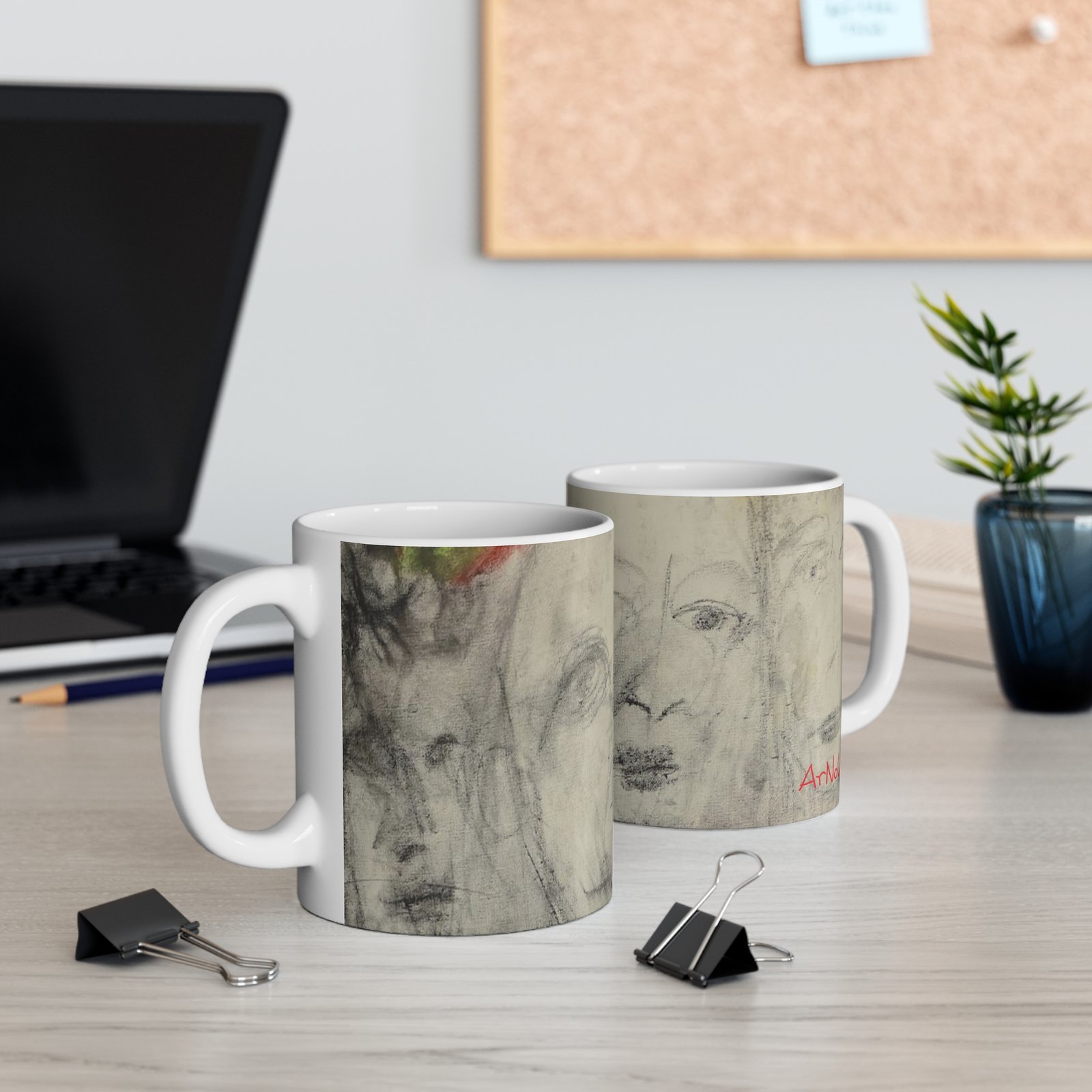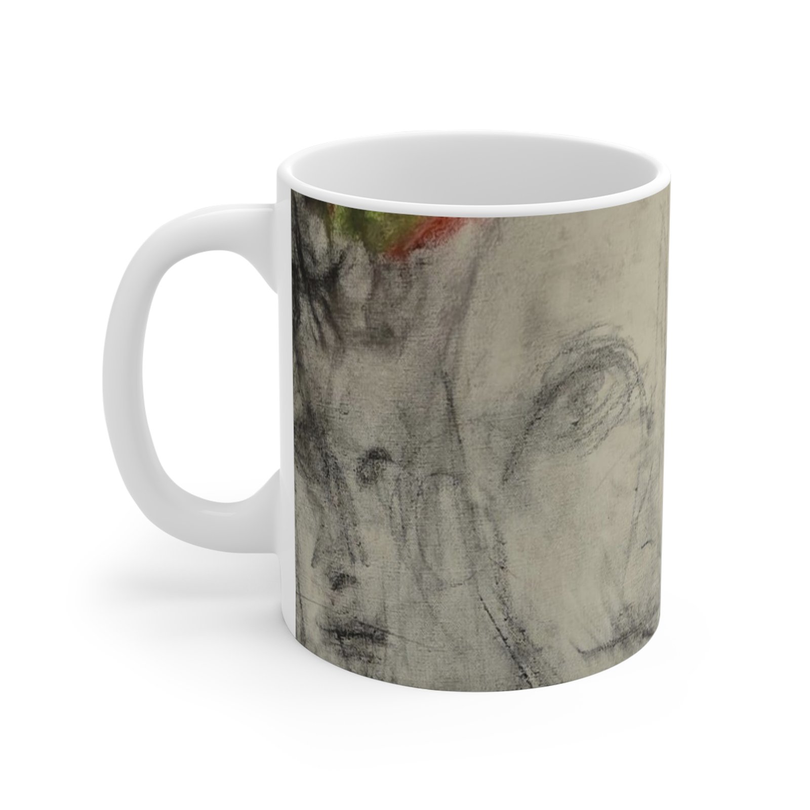 This white ceramic 11oz mug carries a soft, hand-drawn portrait that feels like a quiet conversation over morning coffee. The muted pencil lines and subtle wash of color give it an intimate, sketchbook vibe — gentle, a little mysterious, and deeply human. It sits warm in your hands, the C-handle comfortable for slow sips. Use it when you want a calm moment at your desk, a thoughtful pause between meetings, or something gentle to hold during late-night reading.