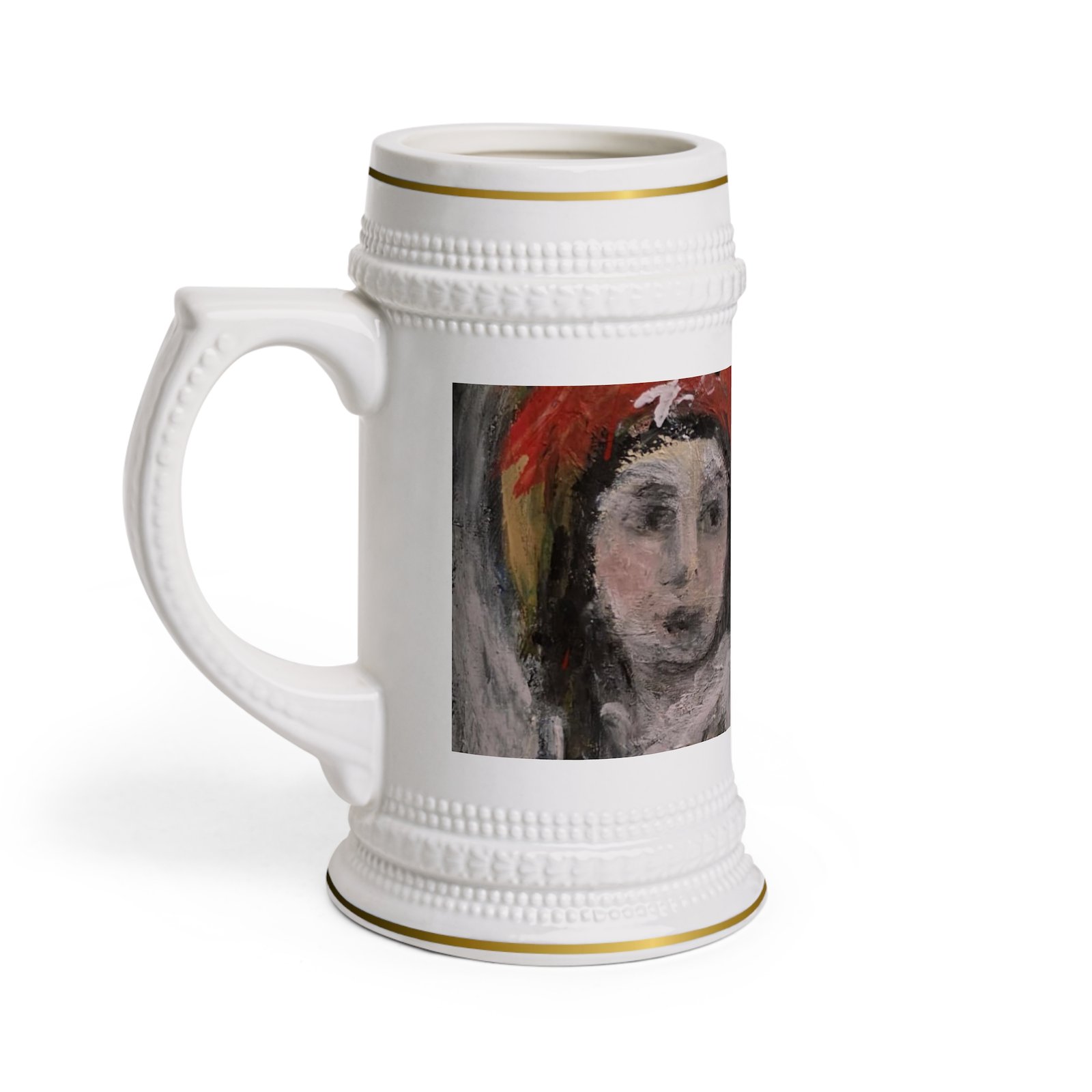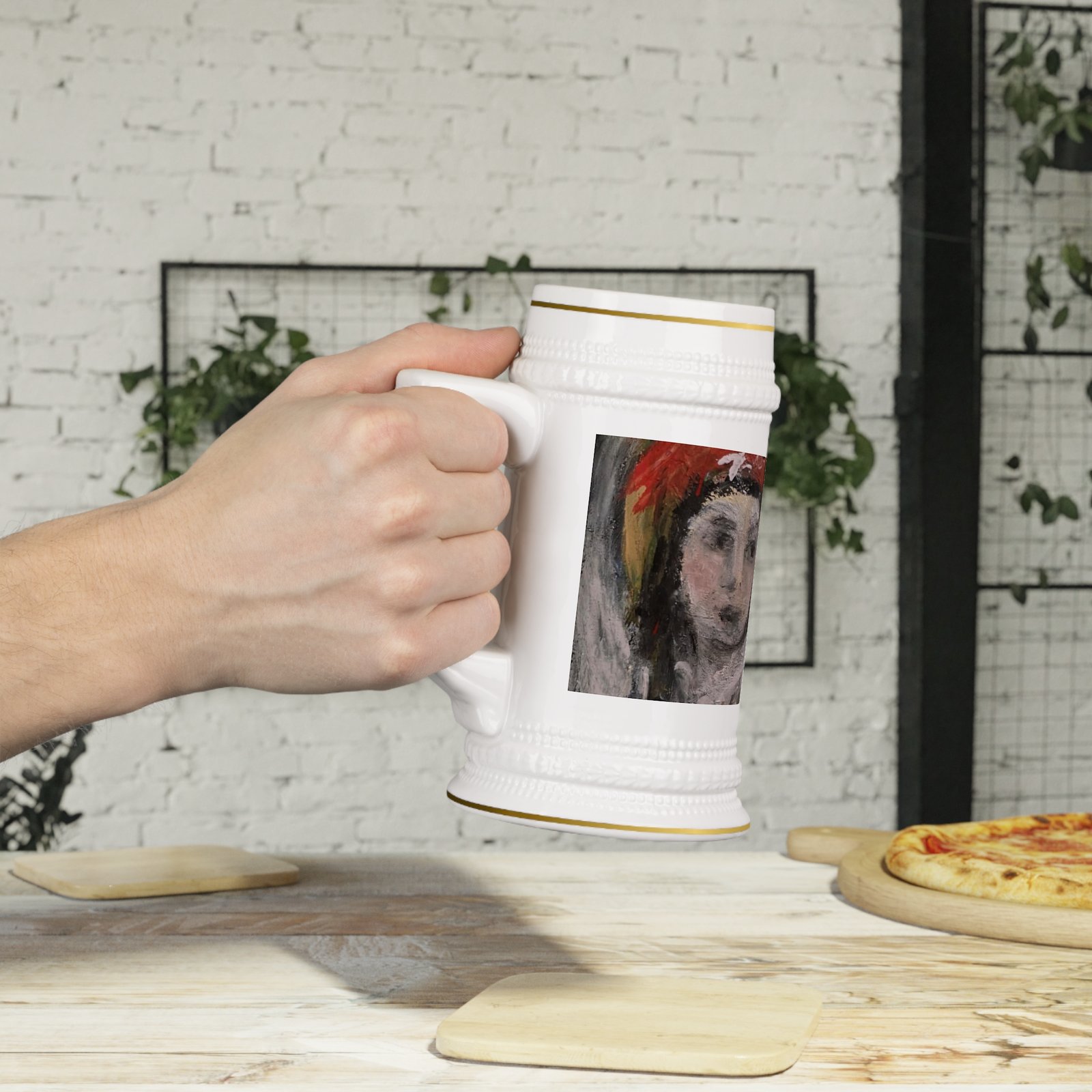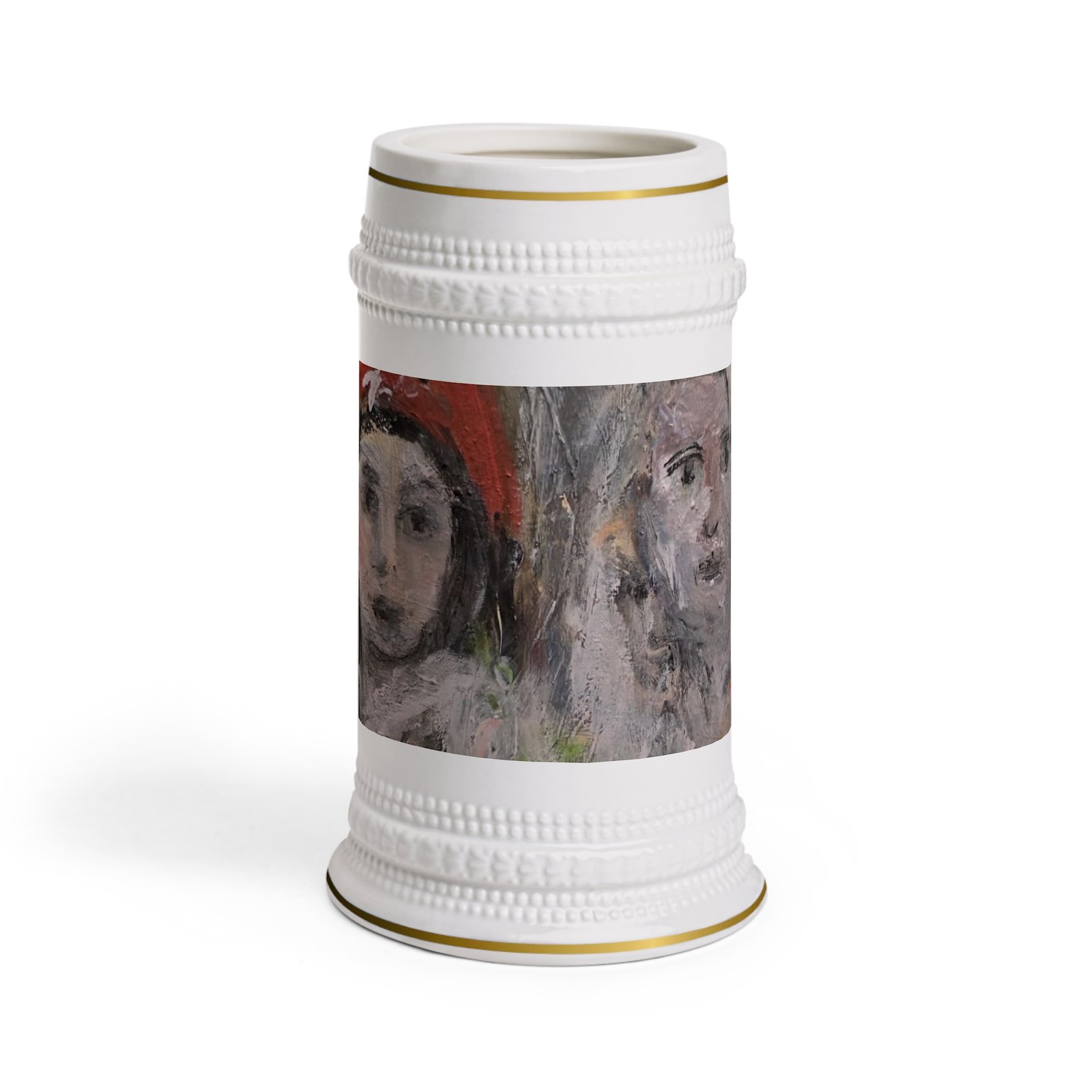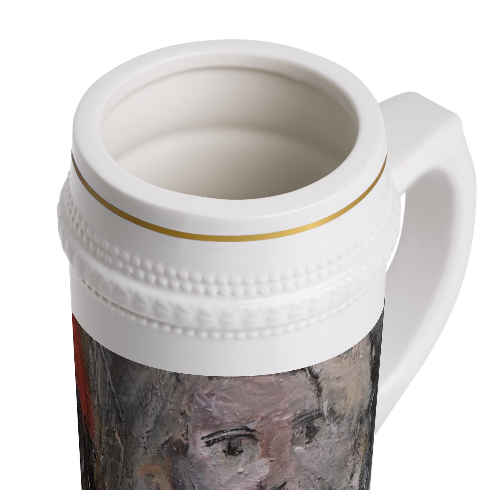 This 22oz ceramic stein brings a touch of gallery warmth to everyday pours. The artwork wraps the body in muted, painterly faces and soft brushwork, giving each sip a moment of quiet reflection. Gold-colored trim on the rim and base catches the light and lifts the look, while the large handle feels steady and confident in hand. Built with a durable ORCA coating for vivid, long-lasting color and dishwasher-safe convenience, this stein is made to be used — not shelved. Note: not microwave-safe.
