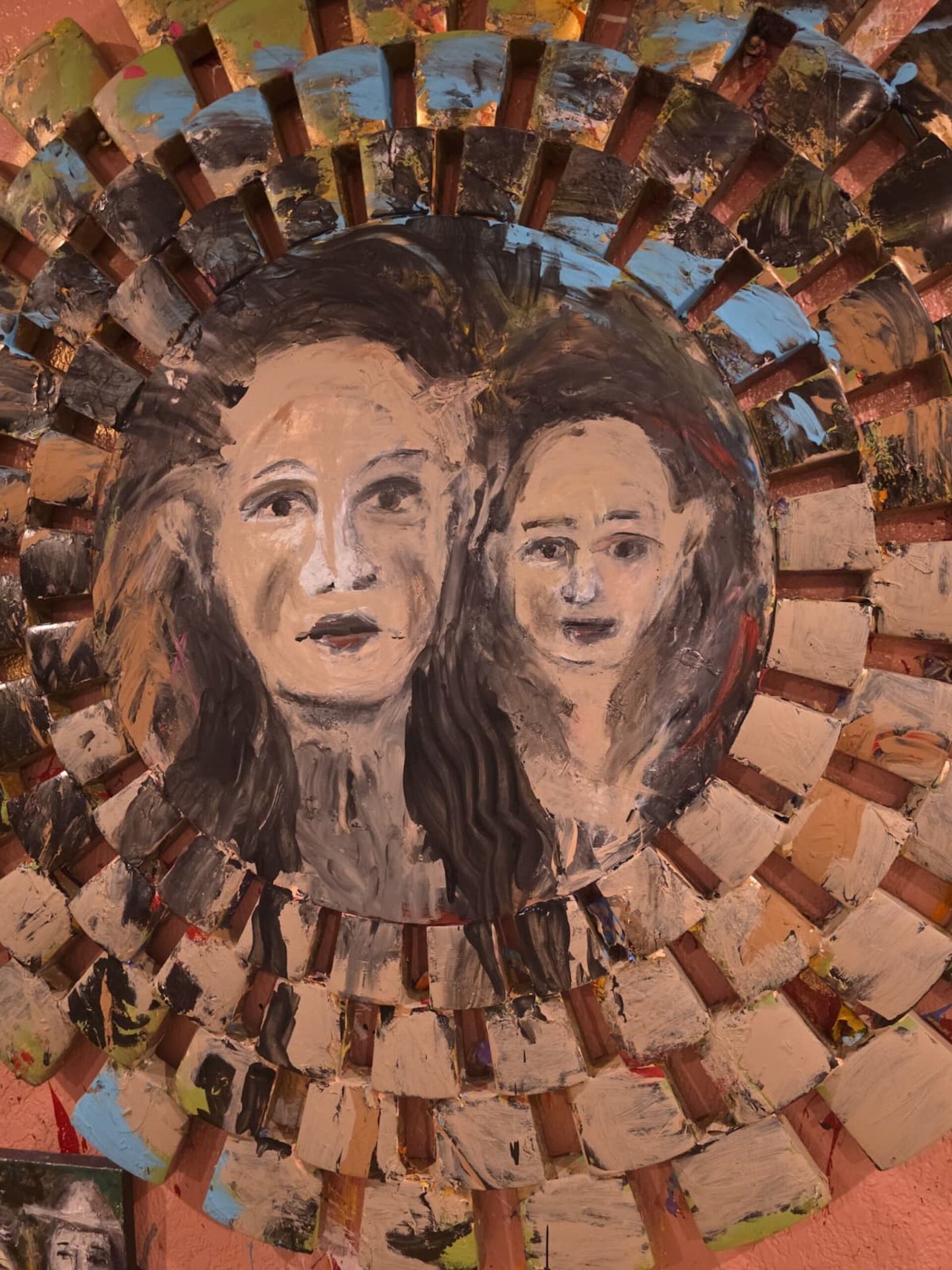 Archangels Descending from Heaven manifests as a radiant, circular vision where the sacred interrupts the material world. At its core, two ethereal faces emerge through gestural, tactile strokes—rendered with an immediacy that privileges spirit over anatomical precision. Their gaze is neither distant nor passive; it is penetrating, witnessing, and quietly intervening.