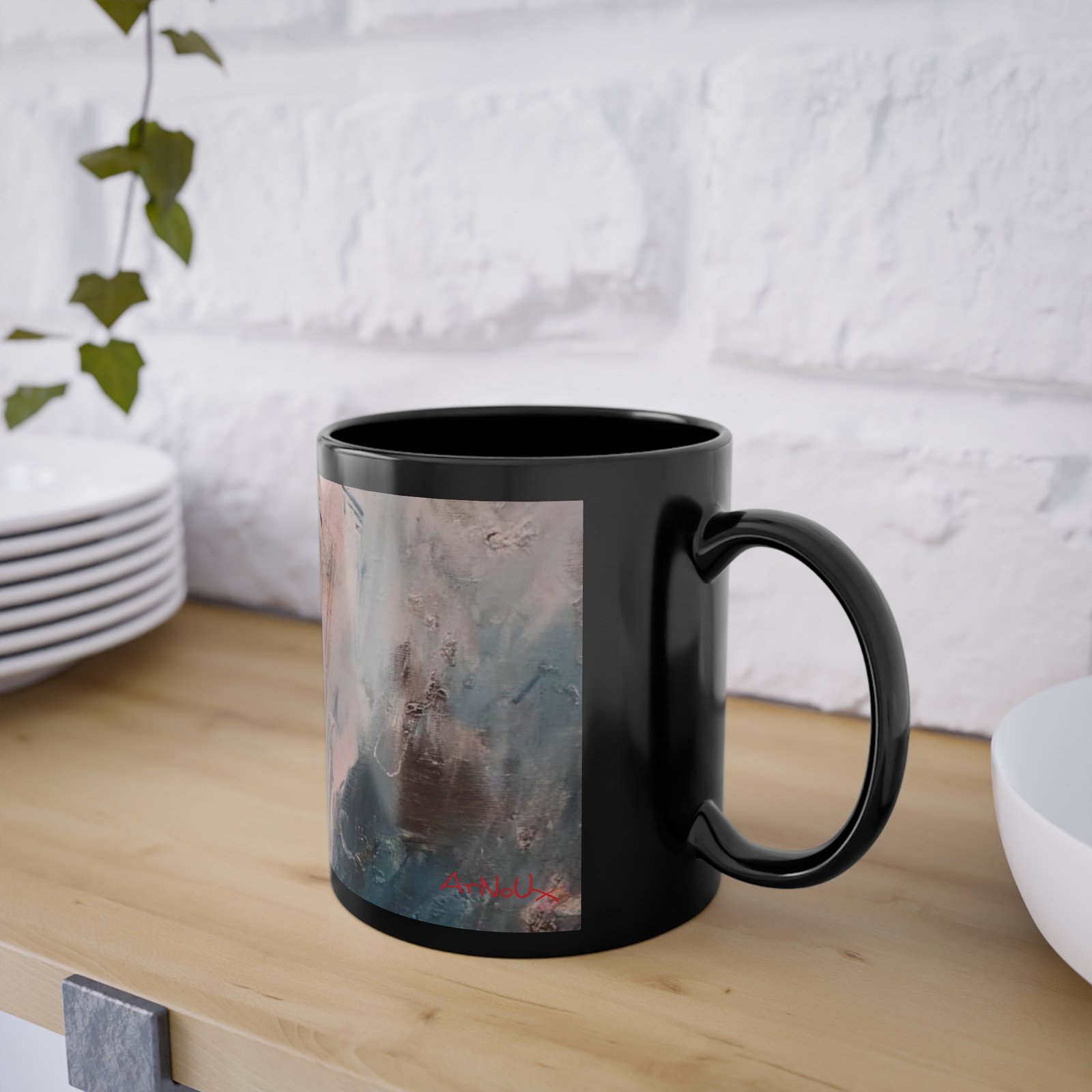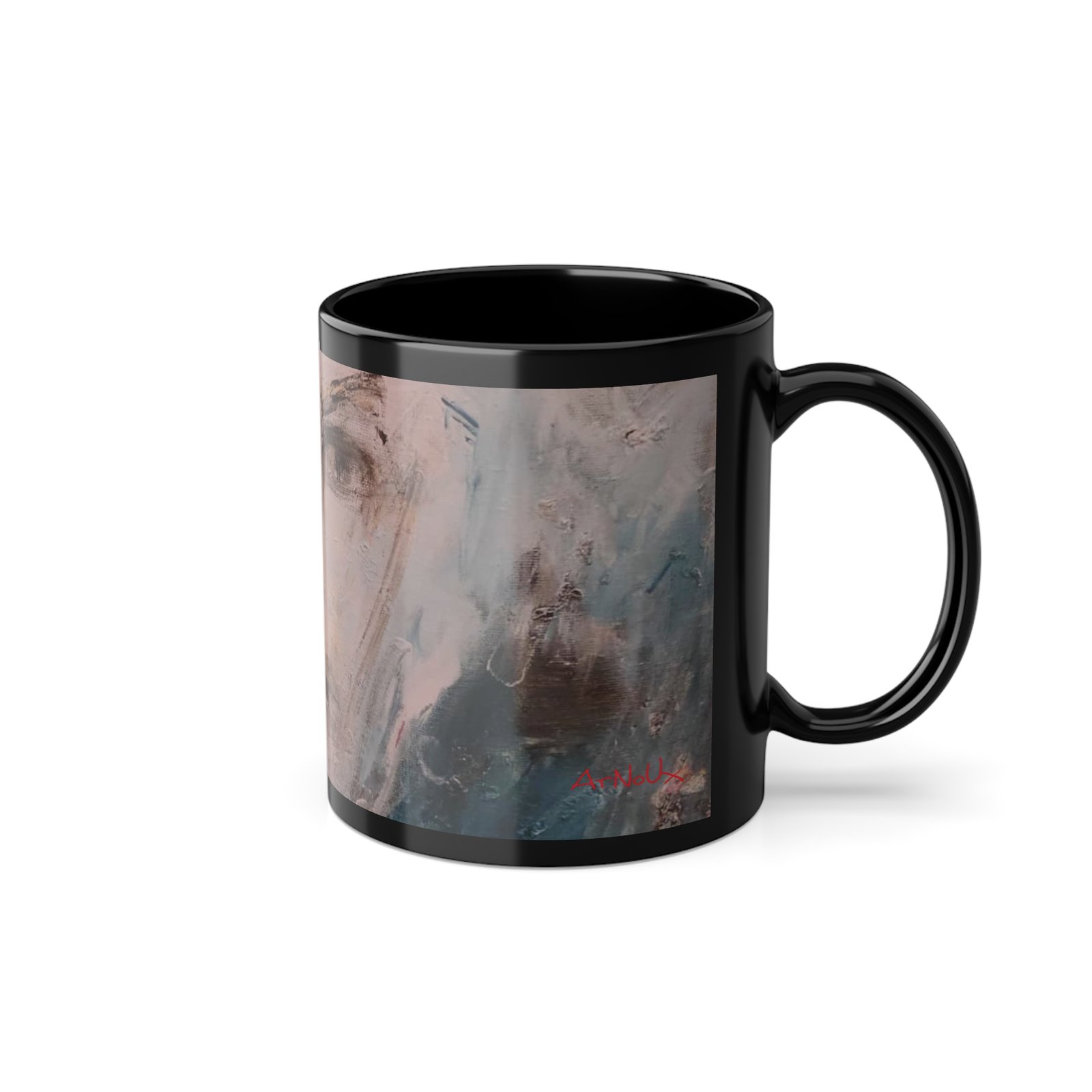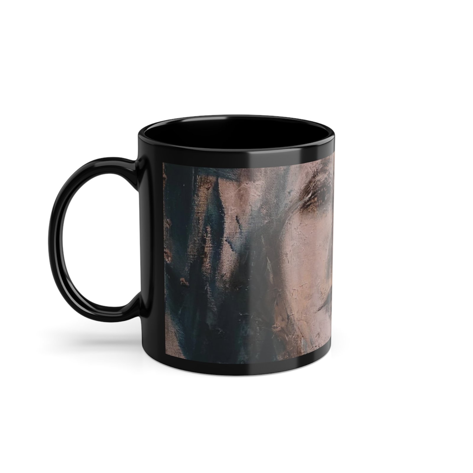 This 11 oz black ceramic mug carries a quiet, contemplative energy — a wraparound painted face that feels like a private conversation over morning coffee. The glossy black body and interior make the artwork feel framed, while muted brushstrokes and soft tones create a calm, reflective atmosphere. Hold it in your hands during slow mornings, sketching breaks, or late-night writing sessions. The C-shaped handle sits comfortably in the palm, and the mug’s compact size keeps drinks warm while inviting you to linger a little longer with whatever fuels your creativity.