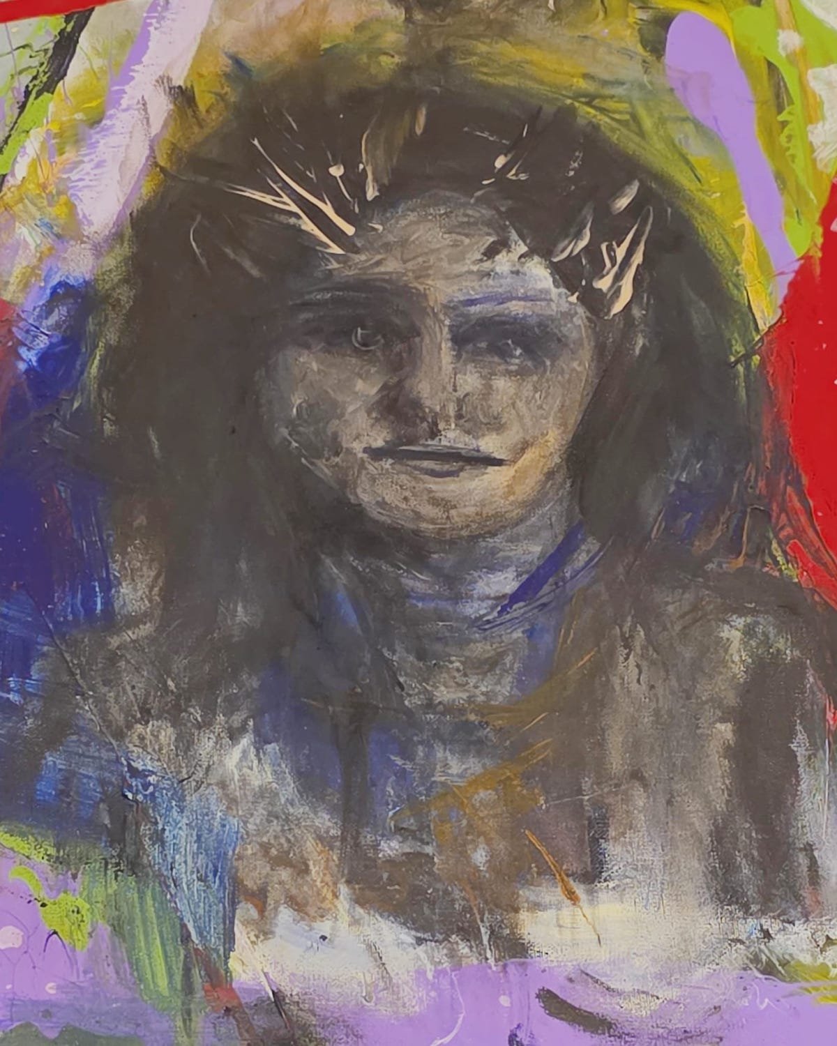 “Bukavetu” evokes the spectral presence of a soul in silent contemplation, emerging from a whirlwind of gestural strokes and electric color fields. The figure’s ethereal face, rendered in ghostly whites and muted violets, stands in contrast to the wild vertical cuts of crimson and lime, signifying conflict, memory, and transcendence. The purple base suggests grounded spirituality, while the explosion of chaotic background energy mirrors the tension between the inner and outer self. Painted during the expressive cycle of 2025, this piece reflects ArNoUx’s commitment to spiritual inquiry through German Expressionist abstraction.
