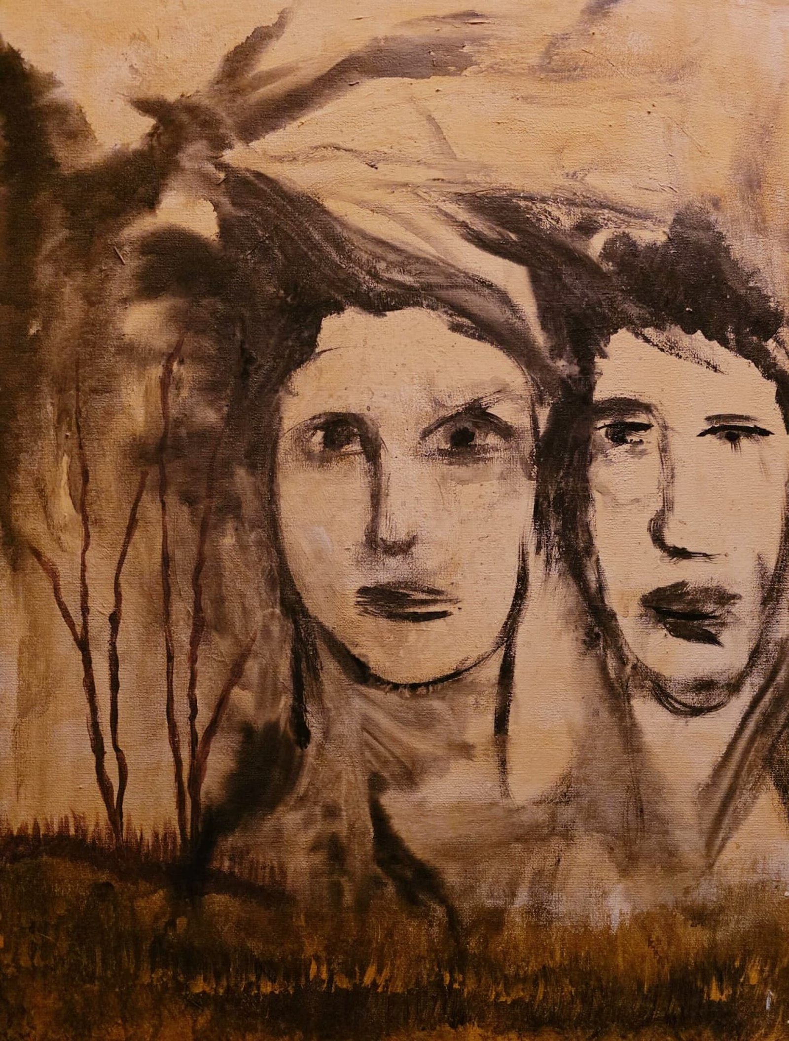 Rendered in a restrained monochromatic palette, the composition emphasizes emotion over detail. The soft blending of forms and the raw, gestural lines suggest a moment of transition—where the spiritual begins to inhabit the physical. The figures do not fully belong to the earth, yet they are no longer distant from it.