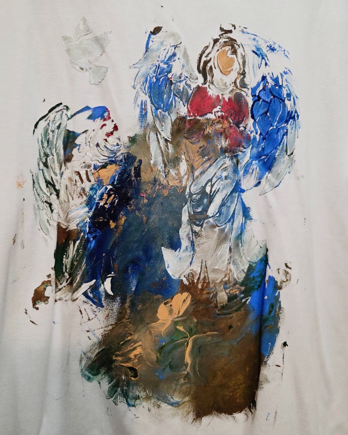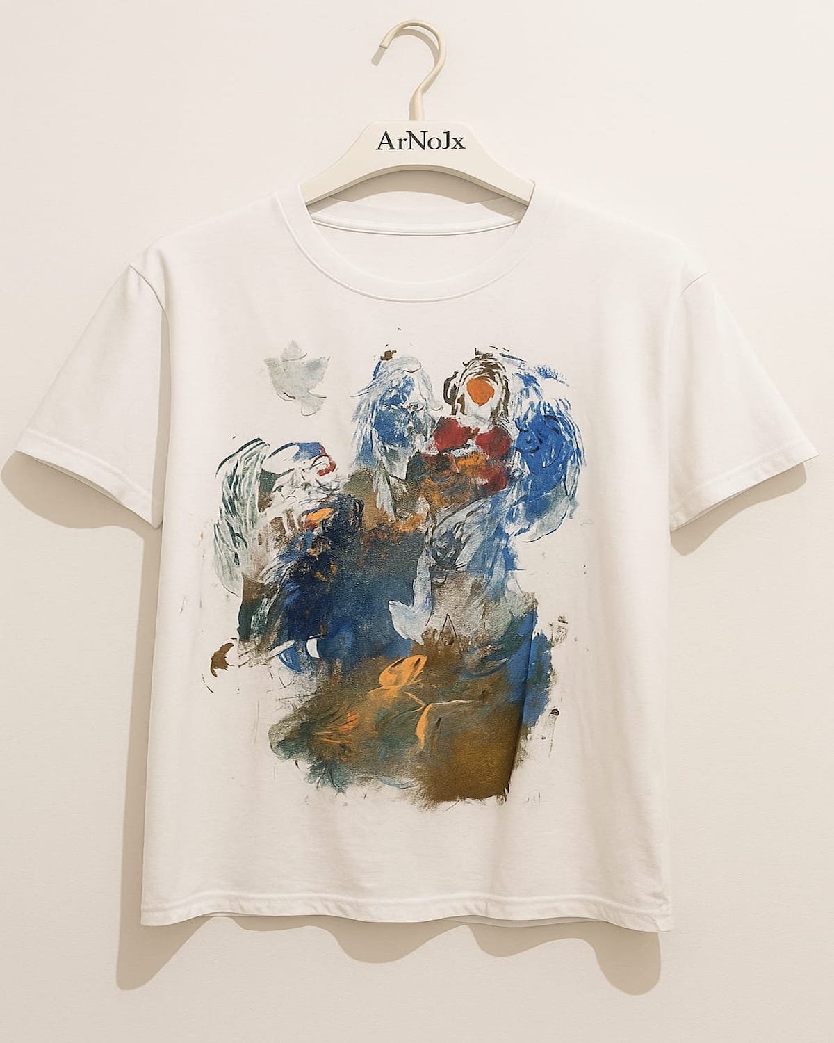 Divine Command of the Angels embodies the sacred mission of God’s messengers, sent to bring healing, strength, and divine protection to humanity. Through expressive brushwork and textured layers of blue, gold, and white, ArNoUx evokes the celestial presence of four angels in motion—each a symbol of faith, light, and restoration. The composition reveals the divine hierarchy where Jesus of Nazareth commands the angels, channeling heavenly energy through art and fabric. This wearable artwork transcends material boundaries, merging faith, movement, and German Expressionist intensity into a single act of devotion.