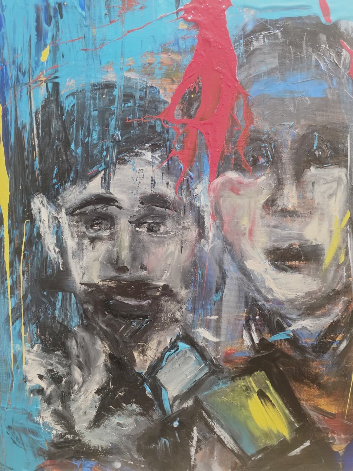 “Don Quixote and Sancho Panza” — painted in the visceral language of German Expressionism, this work channels the inner chaos and idealism of Cervantes’ timeless characters. The artist’s choice of explosive color contrasts — cobalt blues, fiery reds, and ochres — creates a psychological battlefield between illusion and loyalty. The figures emerge through layers of abstraction, symbolizing the blurred line between madness and faith, friendship and delusion. The red stroke above them functions as both divine passion and human suffering, a metaphoric bloodline of artistic resistance.
