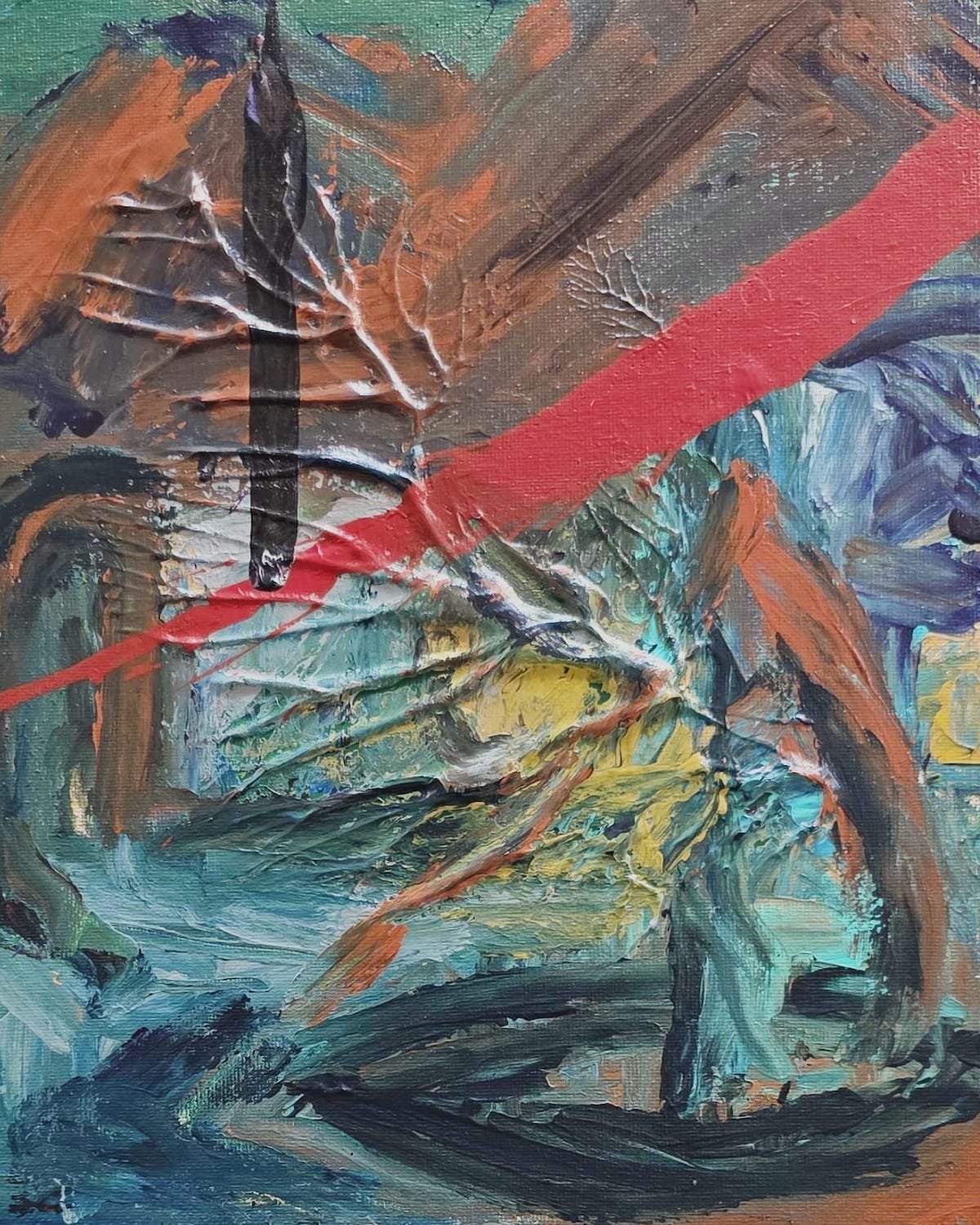 Embrace in the Mist of Gemma’s Expression captures a fleeting moment between two spectral figures locked in an emotional embrace amid a swirling, enigmatic landscape. A diagonal red stroke cuts through the composition like a flash of memory or rupture, while earthy greens and fiery ochres evoke a dreamlike setting—perhaps a forgotten village, veiled in mist and movement. The brushwork is instinctive and textured, heightening the psychological depth of the scene and anchoring it firmly within the expressive traditions of German Expressionism. This work invites the viewer into a space where love, memory, and uncertainty converge.