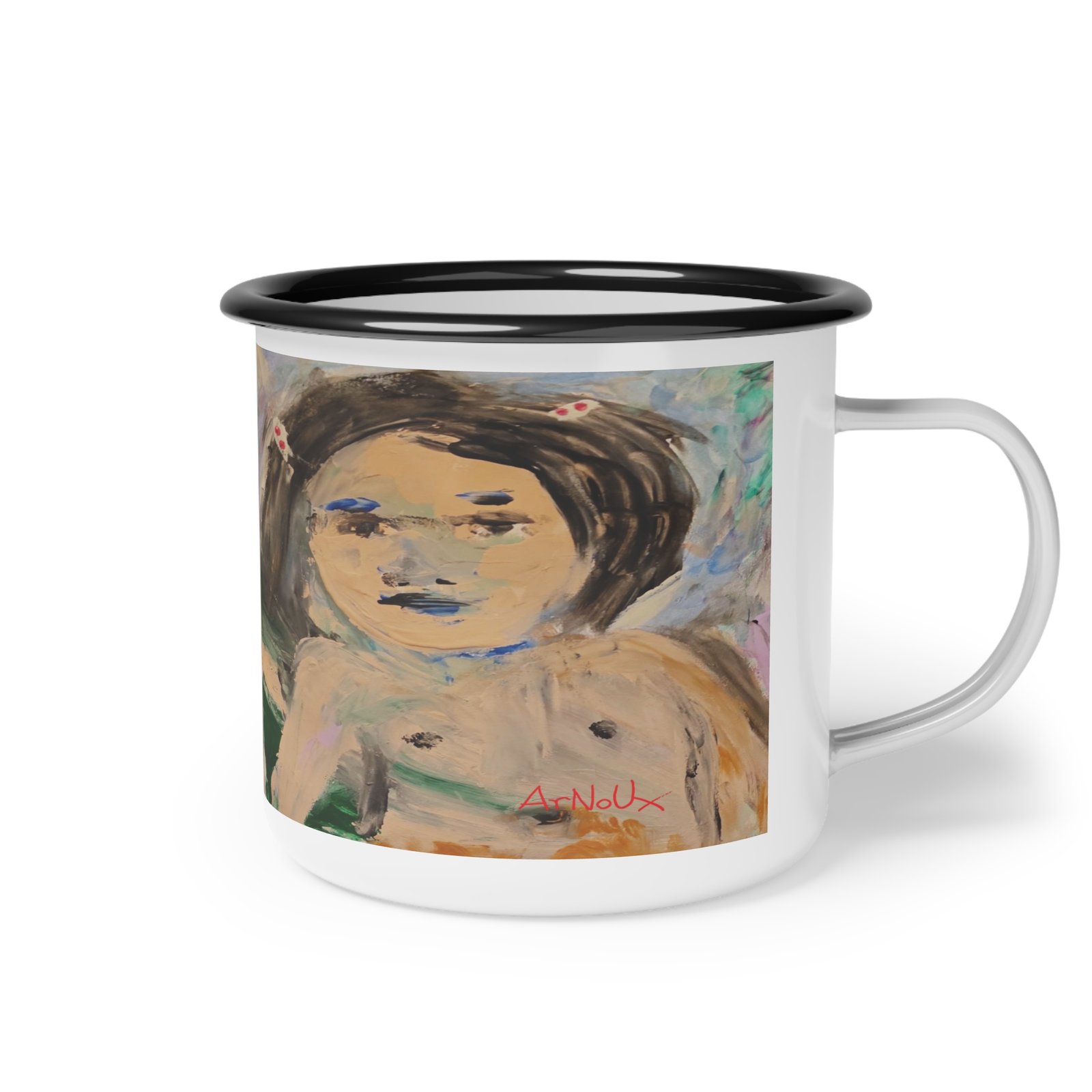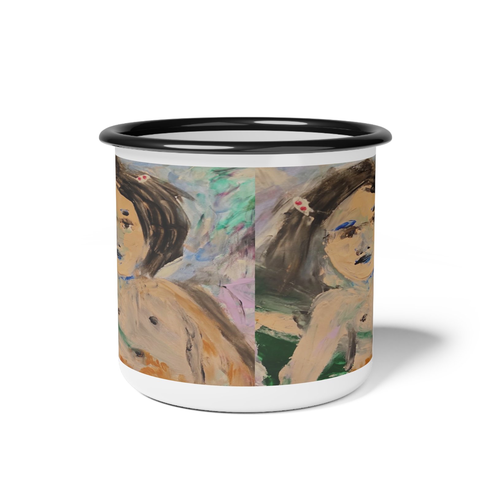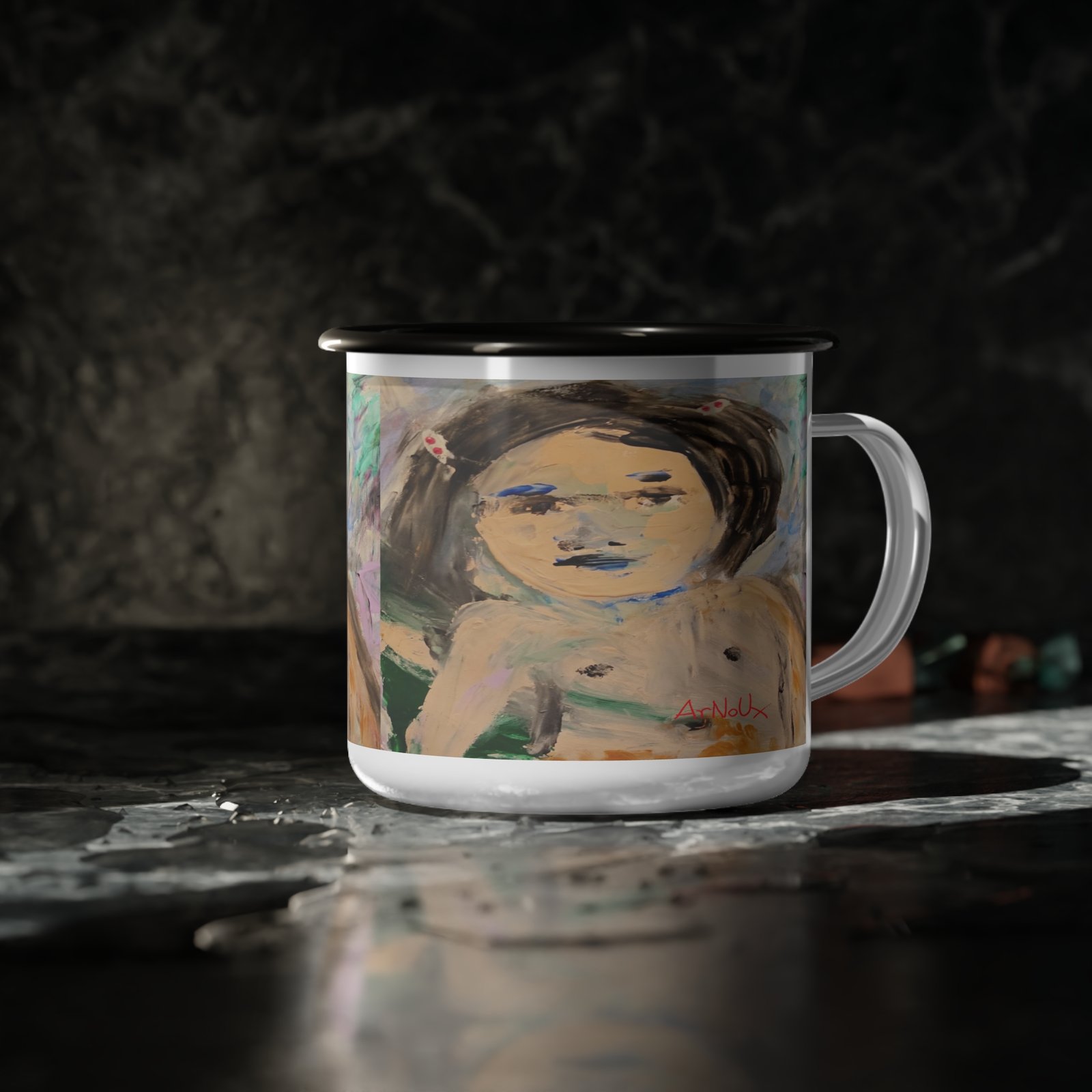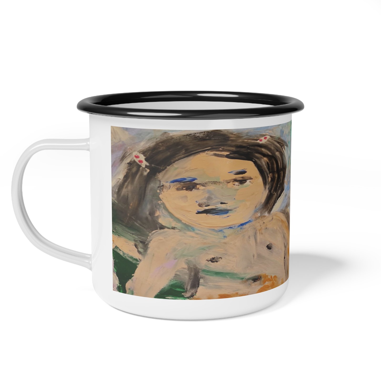 This enamel camp cup feels like a small, soulful companion for slow mornings and restless afternoons. Hand-painted brushstrokes wrap around the glossy white surface, showing a wistful, childlike portrait that invites quiet reflection. Its light weight and sturdy enamel finish mean you can tuck it into a daypack for a lakeside coffee or keep it on a bedside table for tea and moments of reverie. The artwork’s soft, muted palette and imperfect lines give the cup an intimate, lived-in quality — the sort of piece that grows familiar over time and carries the memory of wherever you used it last.
