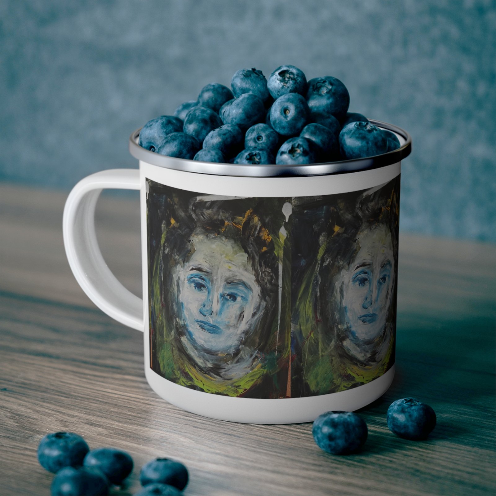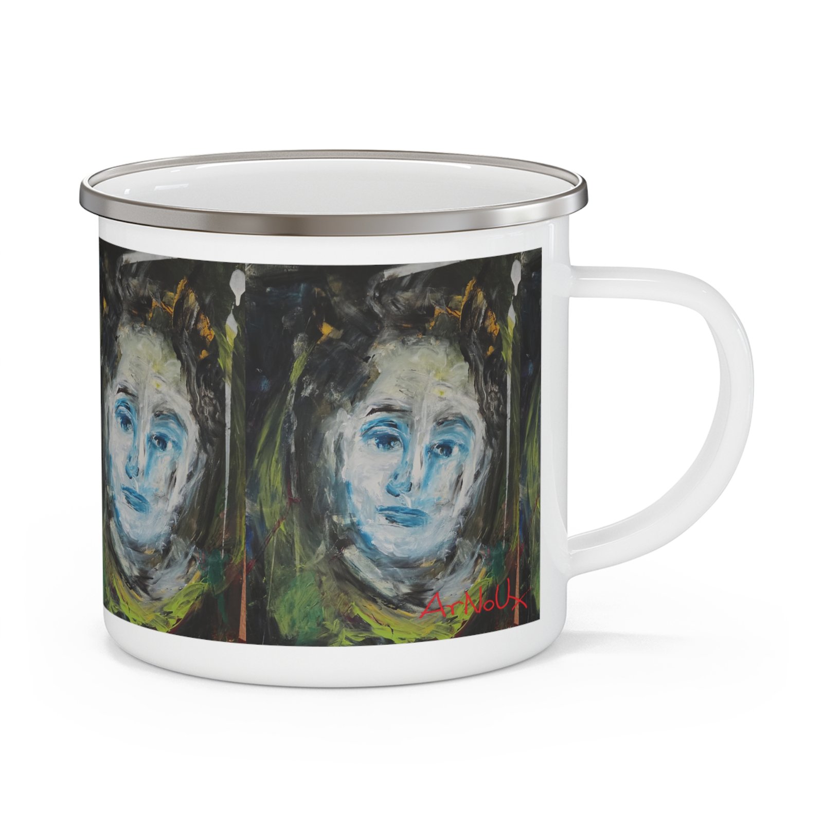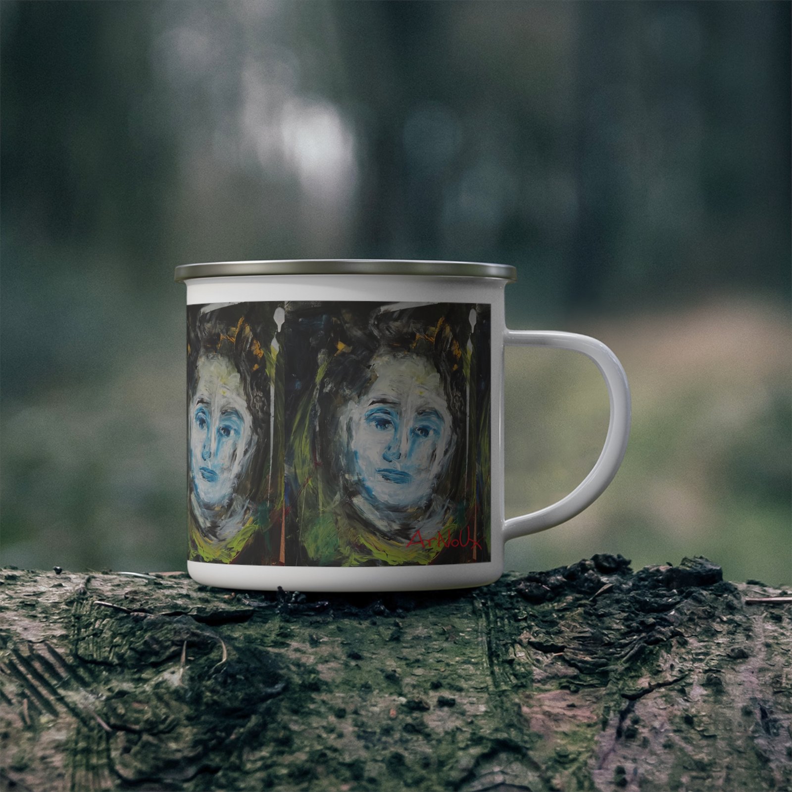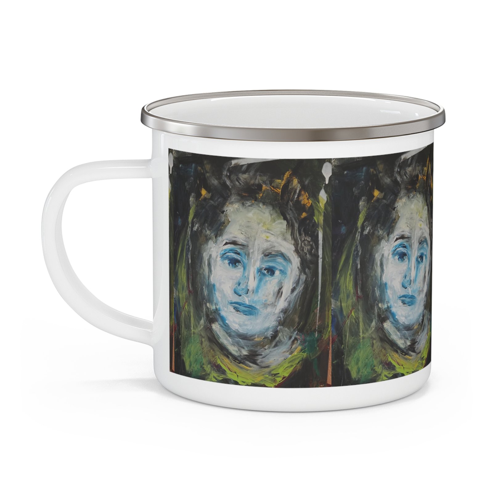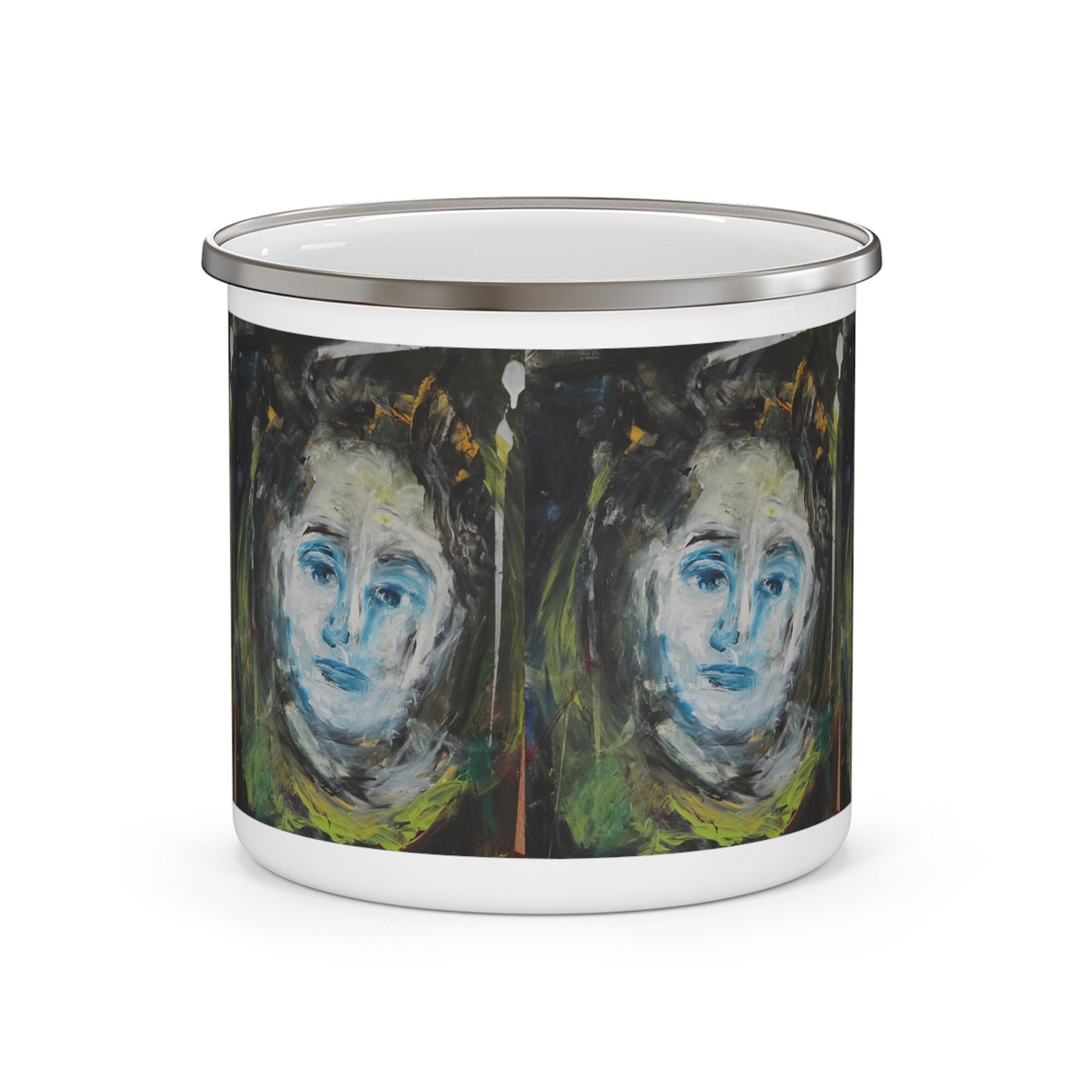 Enamel Mug with Abstract Blue Face Art – Hand-Painted Portrait Camping Cup
