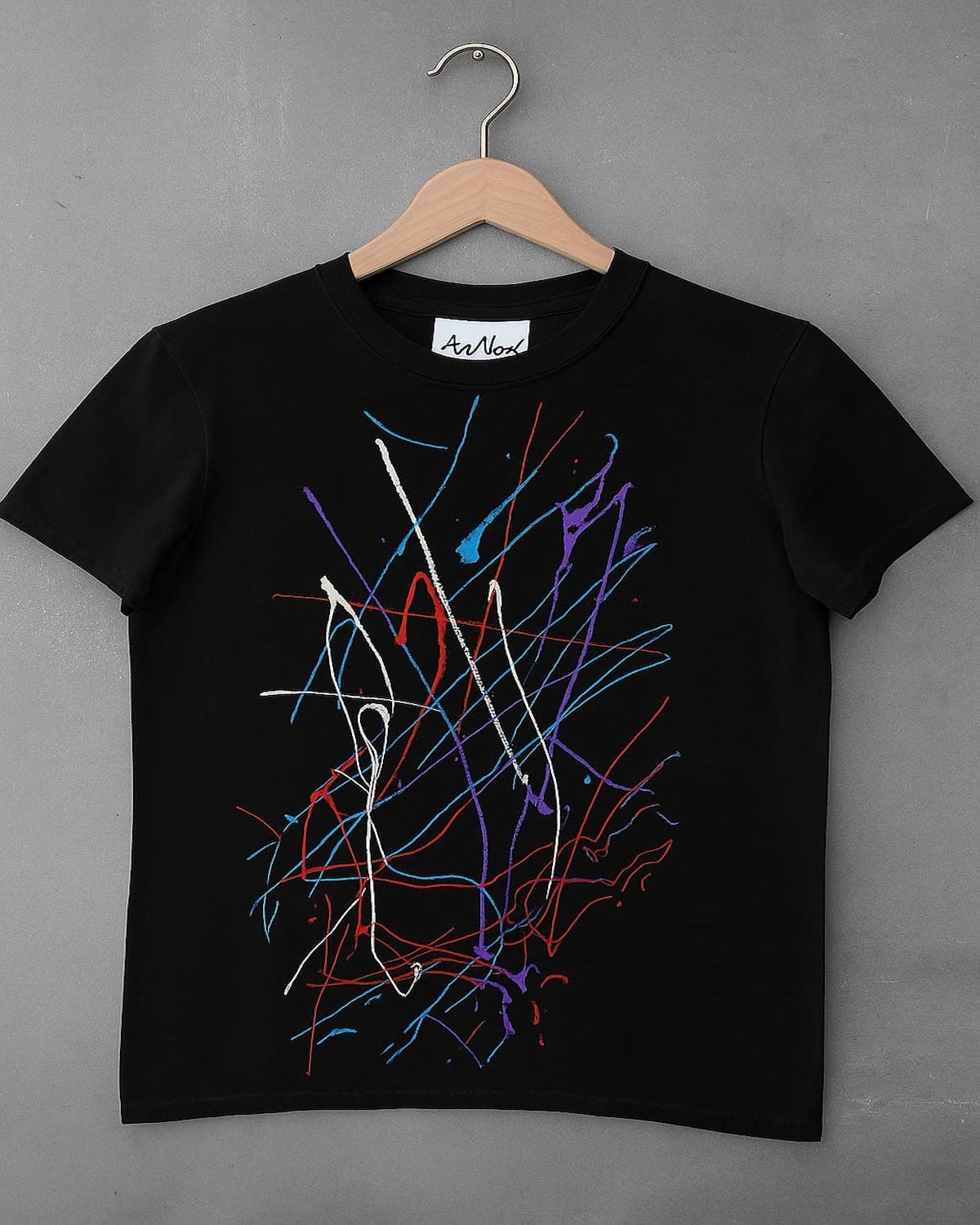 Fireworks at Night extends ArNoUx’s exploration of spiritual renewal into the darkness of introspection. Painted on a black cotton T-shirt, the vibrant strokes of red, blue, white, and violet burst like celestial trails across the night sky — symbolizing divine revelation emerging from inner silence.