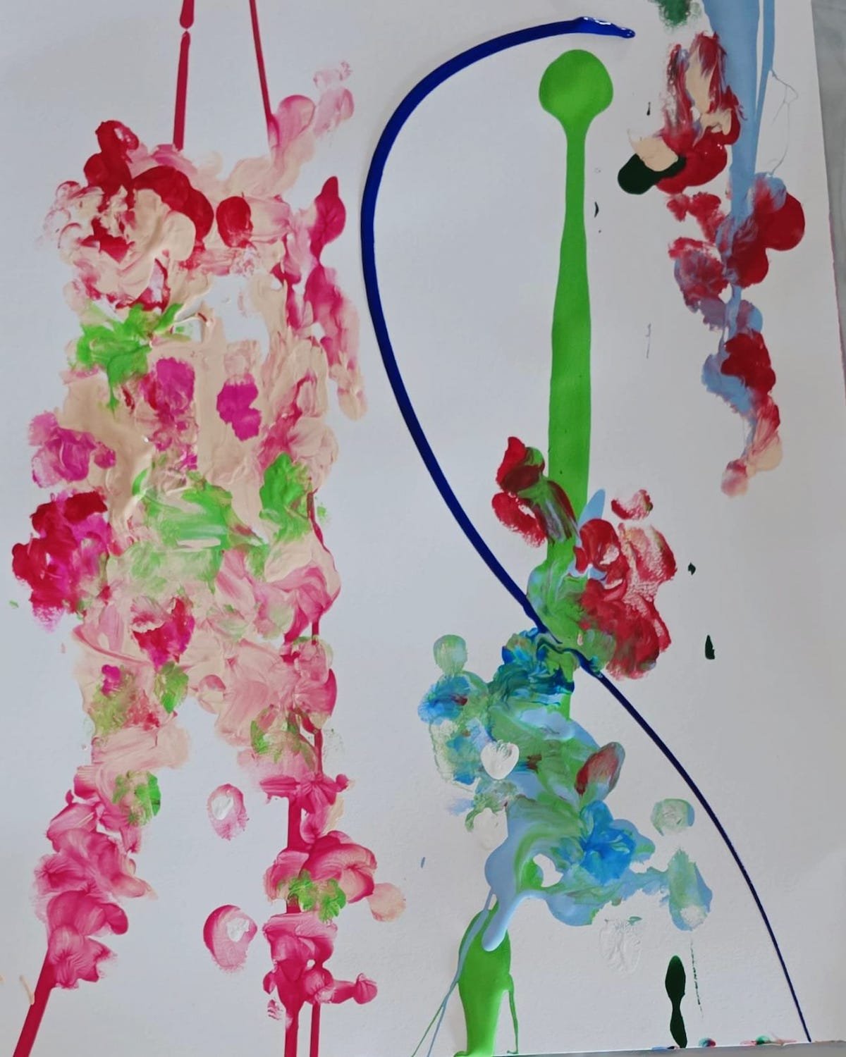 The vibrant strokes of pink, red, and soft green suggest floral shapes falling like blessings—petals drifting from a higher realm directly into the life of the figure forming within the movement of the lines.