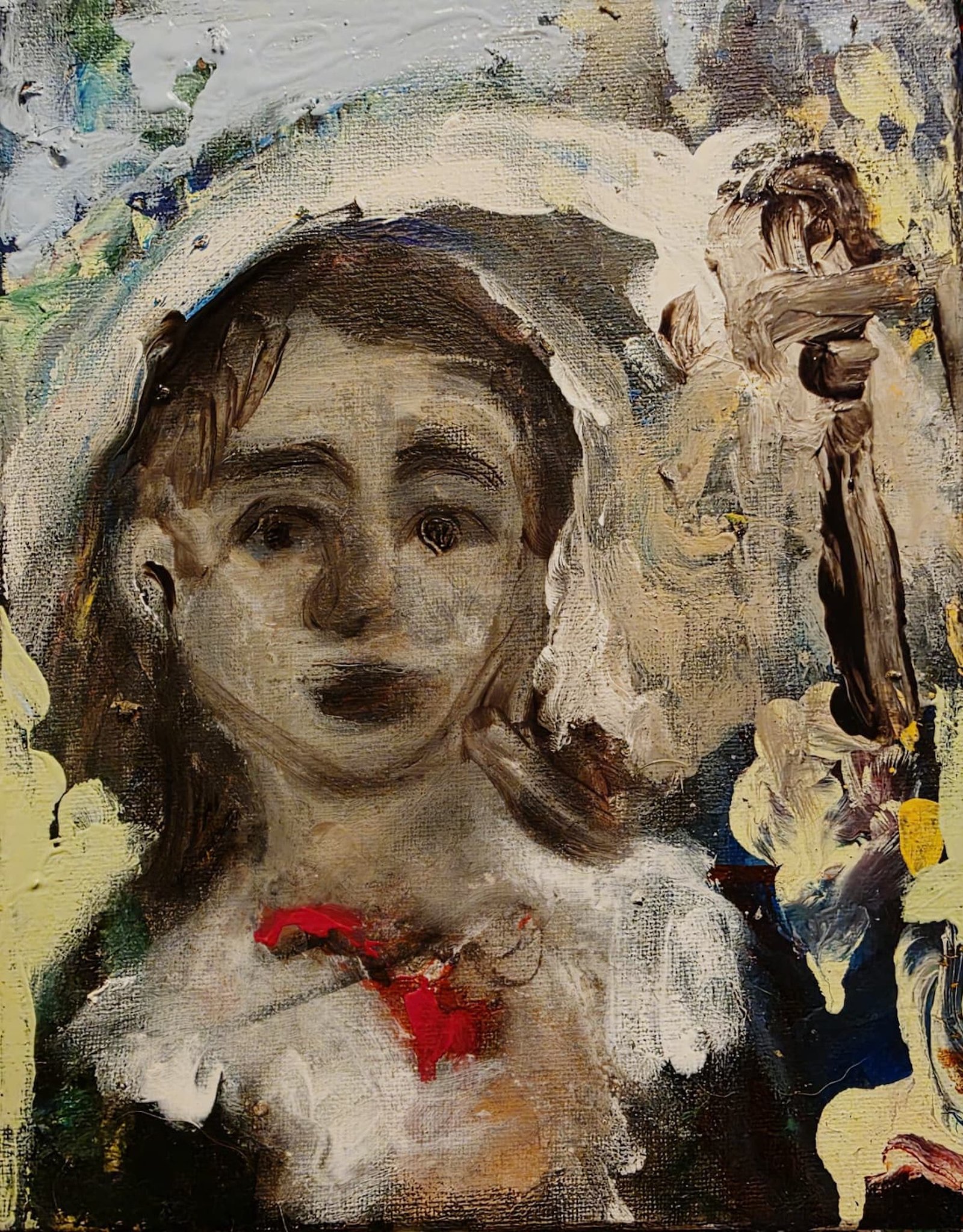 At the center of the composition, the red heart becomes the symbolic offering: the human heart given freely to Jesus. It represents faith, vulnerability, and the profound trust that defines Christian devotion. The surrounding brushwork—raw, layered, and expressive—suggests the inner turbulence of the human spirit before it finds peace in divine love.