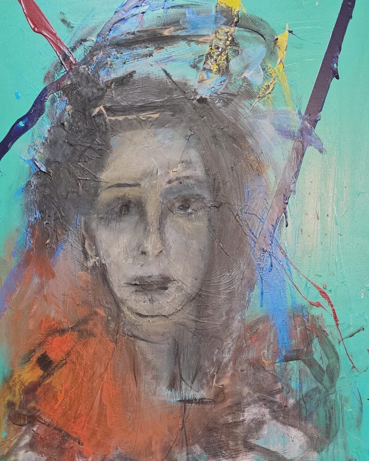 The piece belongs to a unique artistic dialogue: Minimalist Expressionism informed by the German Expressionist tradition. Through bold abstraction, the canvas becomes a battlefield of inner conflict. The green background reflects a false calm; beneath it lies the agony of lost power and love. The rough textures over the eyes, the smears over the mouth, the bleeding colors—everything alludes to a man torn between his duty to Rome and his surrender to Cleopatra.