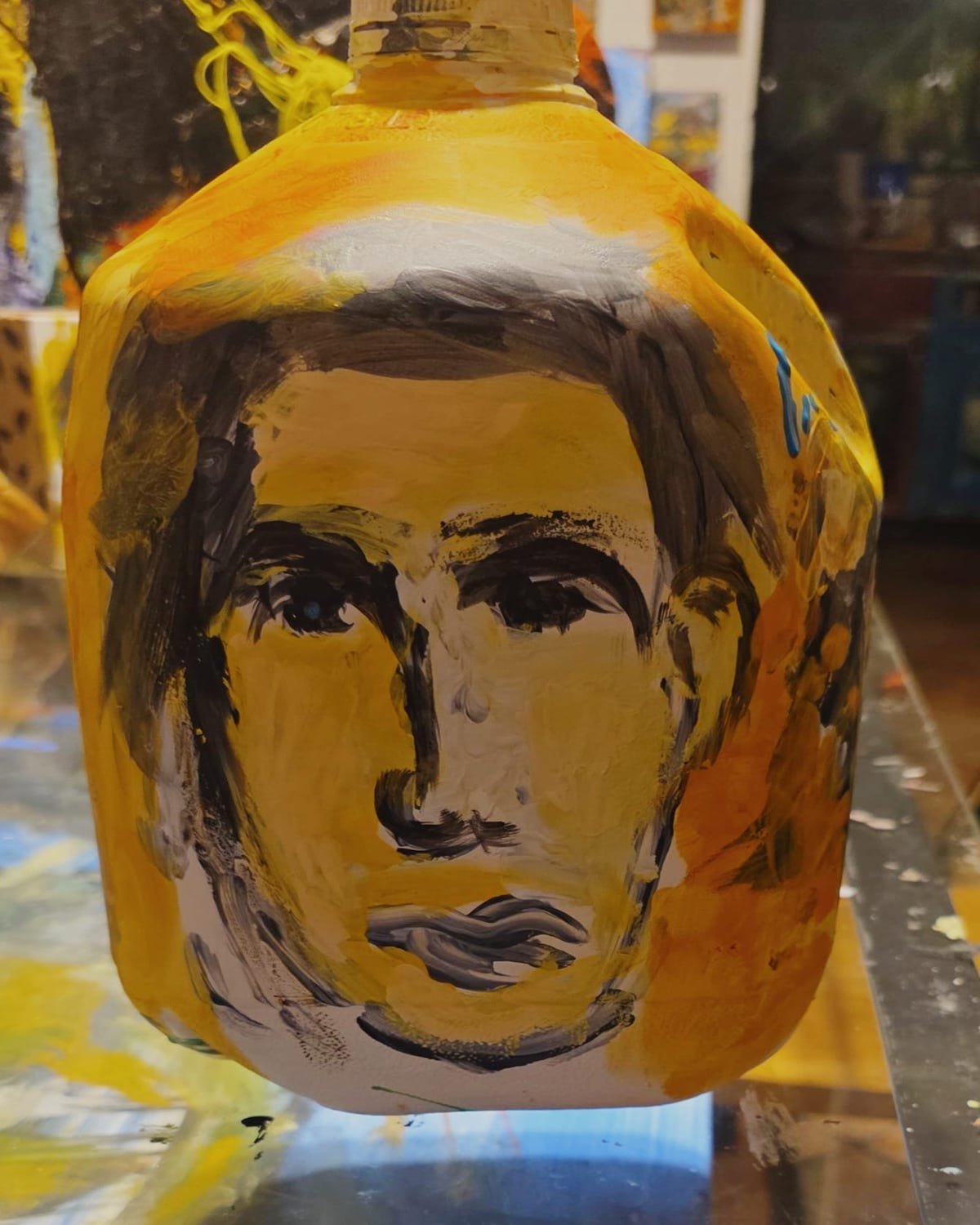 This work transforms a simple recycled water gallon into a spiritual object through the raw intensity of German Expressionism. Two angelic faces emerge from bold strokes of acrylic, their features shaped with emotion, contrast, and divine presence.
