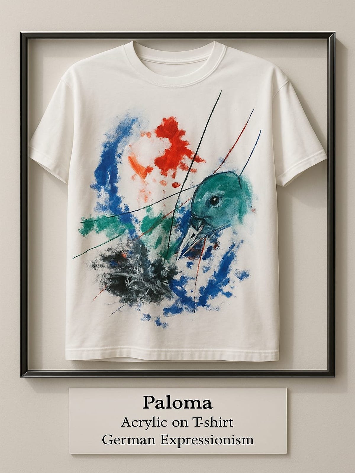Las líneas diagonales que cruzan la composición evocan movimiento y tensión: el vuelo contenido, la búsqueda de un cielo propio. El artista se aparta del soporte tradicional para llevar el expresionismo a una dimensión cotidiana — una camisa que deja de ser ropa para convertirse en cuerpo pictórico.