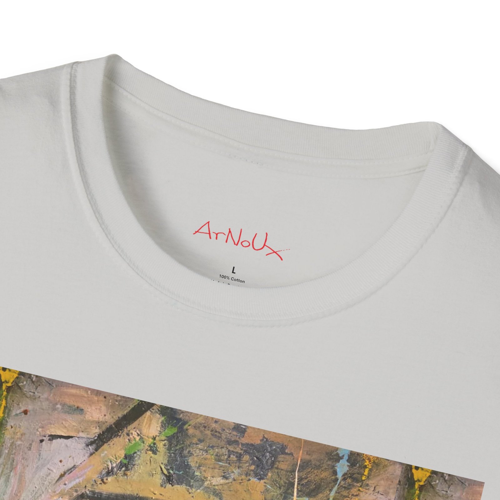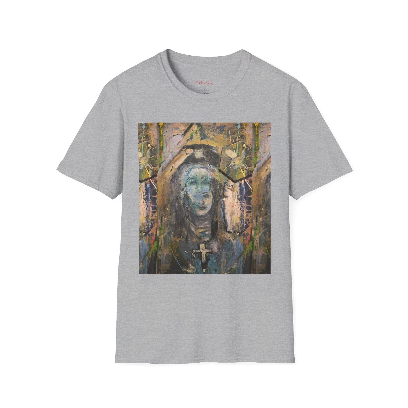 A lightweight, art-forward tee that wears like a second skin and carries quiet storytelling in every brushstroke. The soft, ring-spun cotton feels gentle against the skin while the printed paintings—one front, one back—turn the shirt into a wearable canvas. Colors soak into the fabric with painterly texture: muted greens, warm ochres, and pale turquoises blend into a layered, contemplative portrait on the chest and a more intimate, expressive figure on the back. It settles easily into everyday life — layered under a denim jacket, paired with relaxed trousers, or worn alone on warmer days — and invites conversation without shouting. For people who live around art, memory, and subtle symbolism, this tee feels personal: like carrying a small gallery with you, a piece that ages gracefully as it absorbs washes, wear, and weather.