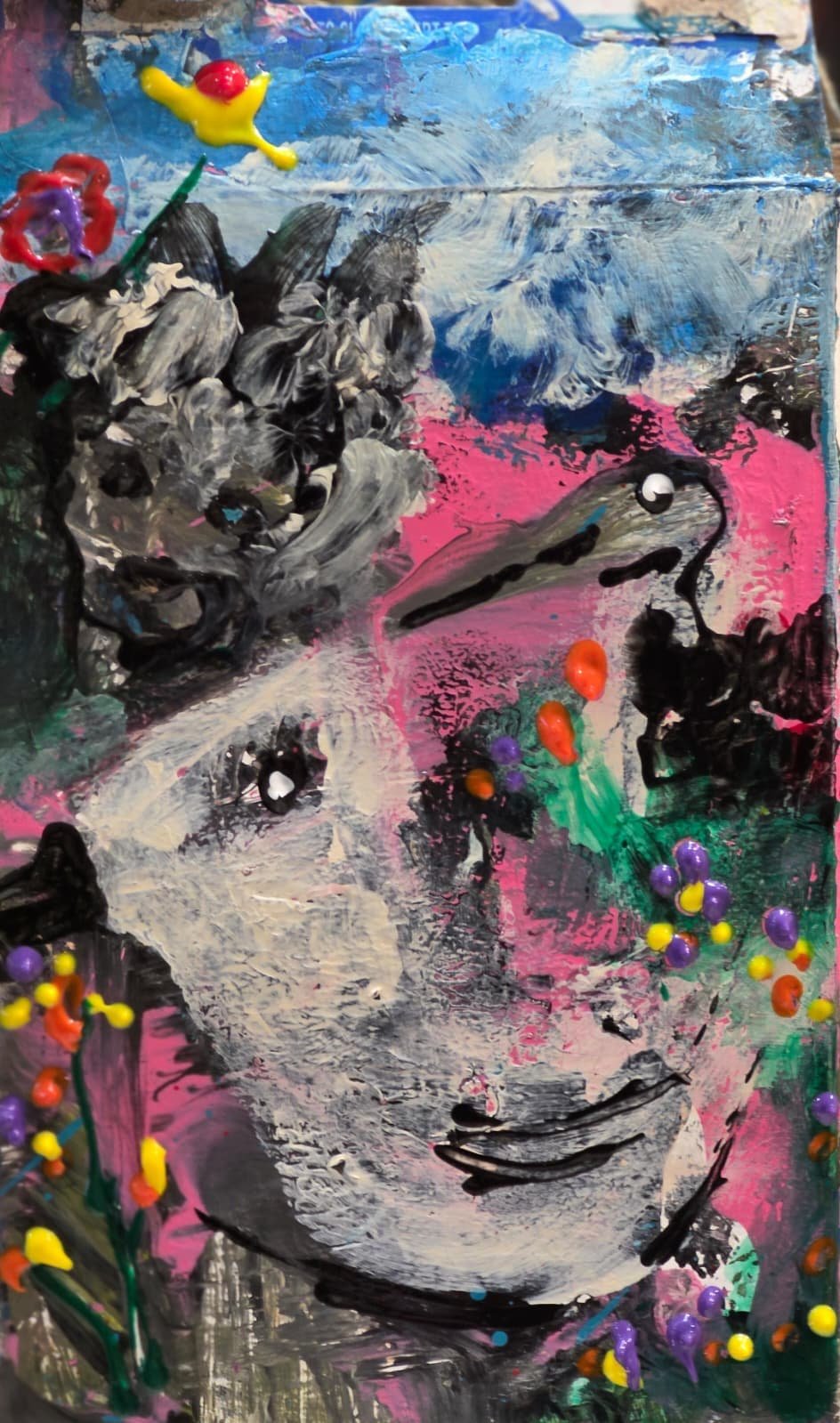 Created on a reclaimed Pop Secret popcorn box, this piece by ArNoUx transforms everyday packaging into a spiritual allegory. Layers of acrylic in vivid pinks, sky blues, and whites depict birds in flight — symbols of freedom, revelation, and divine transcendence. The subtle human face emerging through textured brushstrokes evokes the inner self seeking liberation beyond material form. The balance between chaos and serenity mirrors the artist’s recurring dialogue with spiritual independence: to rise above fear and find peace through divine connection.