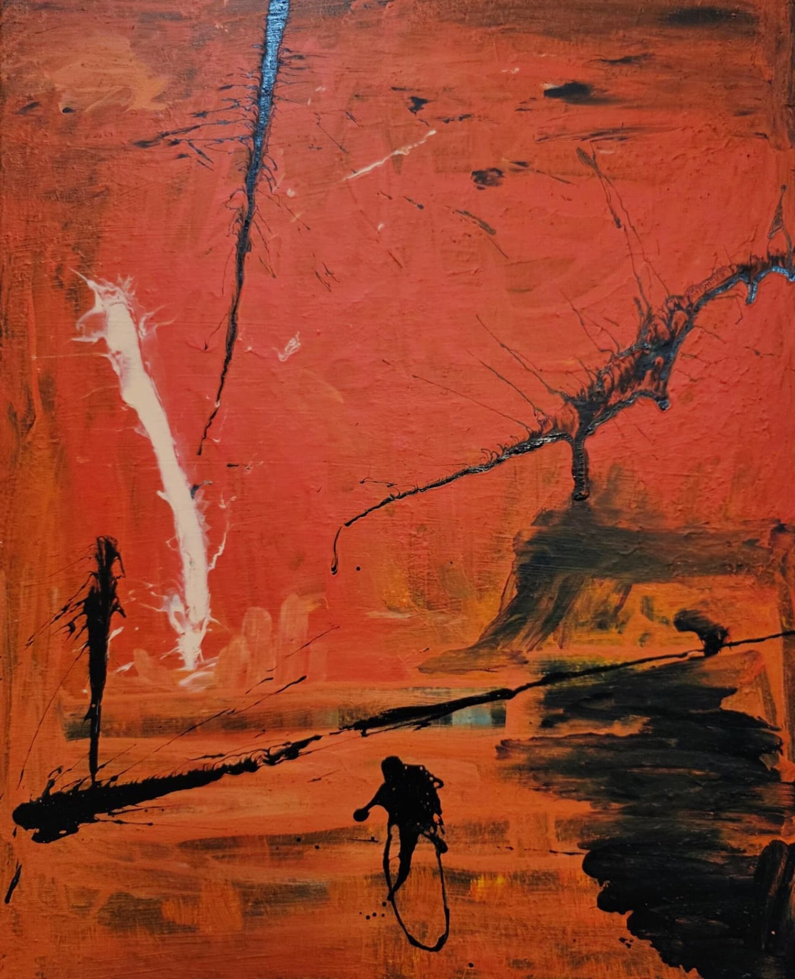 The small black silhouettes appear almost like fleeting presences—human yet symbolic—reduced to essential forms. One figure suggests the playful act of jumping rope, transforming a simple childhood movement into a metaphor of spiritual resilience and innocence. Above, explosive gestural marks and dripping lines evoke unseen forces moving through the sky, suggesting divine energy or celestial intervention.