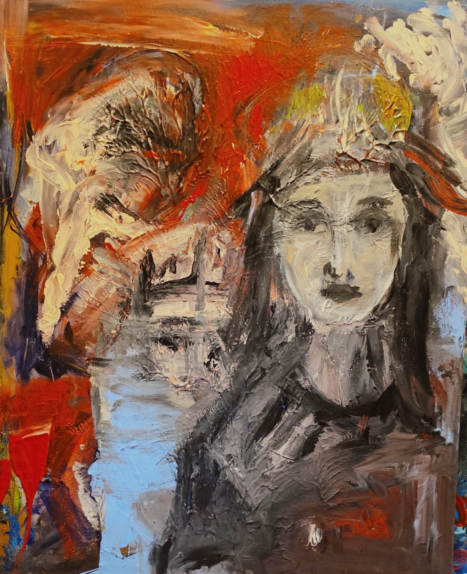 The thick impasto strokes and turbulent chromatic contrasts evoke the emotional intensity characteristic of German Expressionism. Reds and burnt oranges dominate the background, symbolizing destruction, chaos, and the violent heat of warfare. Against this inferno, the pale faces emerge like fragile reflections of humanity itself—vulnerable, questioning, and spiritually exposed.
