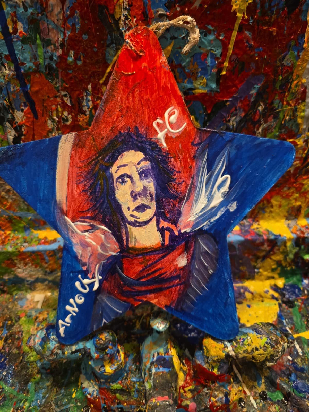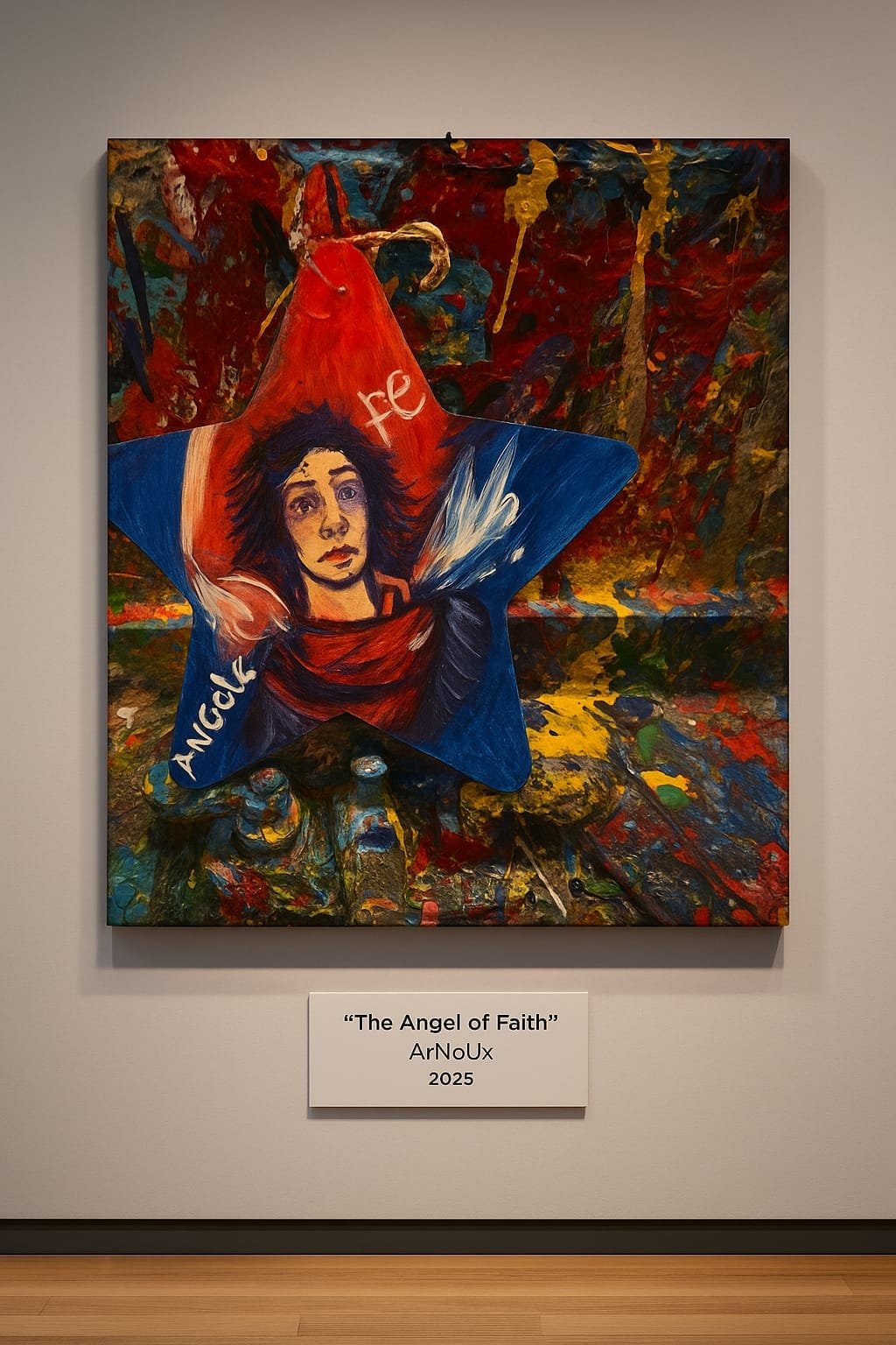 This wooden star, hand-painted by ArNoUx, embodies the spiritual strength and conviction required to resist temptation and remain rooted in divine purpose. The central figure—an expressive angel rendered in deep reds, luminous blues, and emotional brushstrokes—represents Faith itself: the inner guardian that lifts the human spirit when darkness surrounds it.