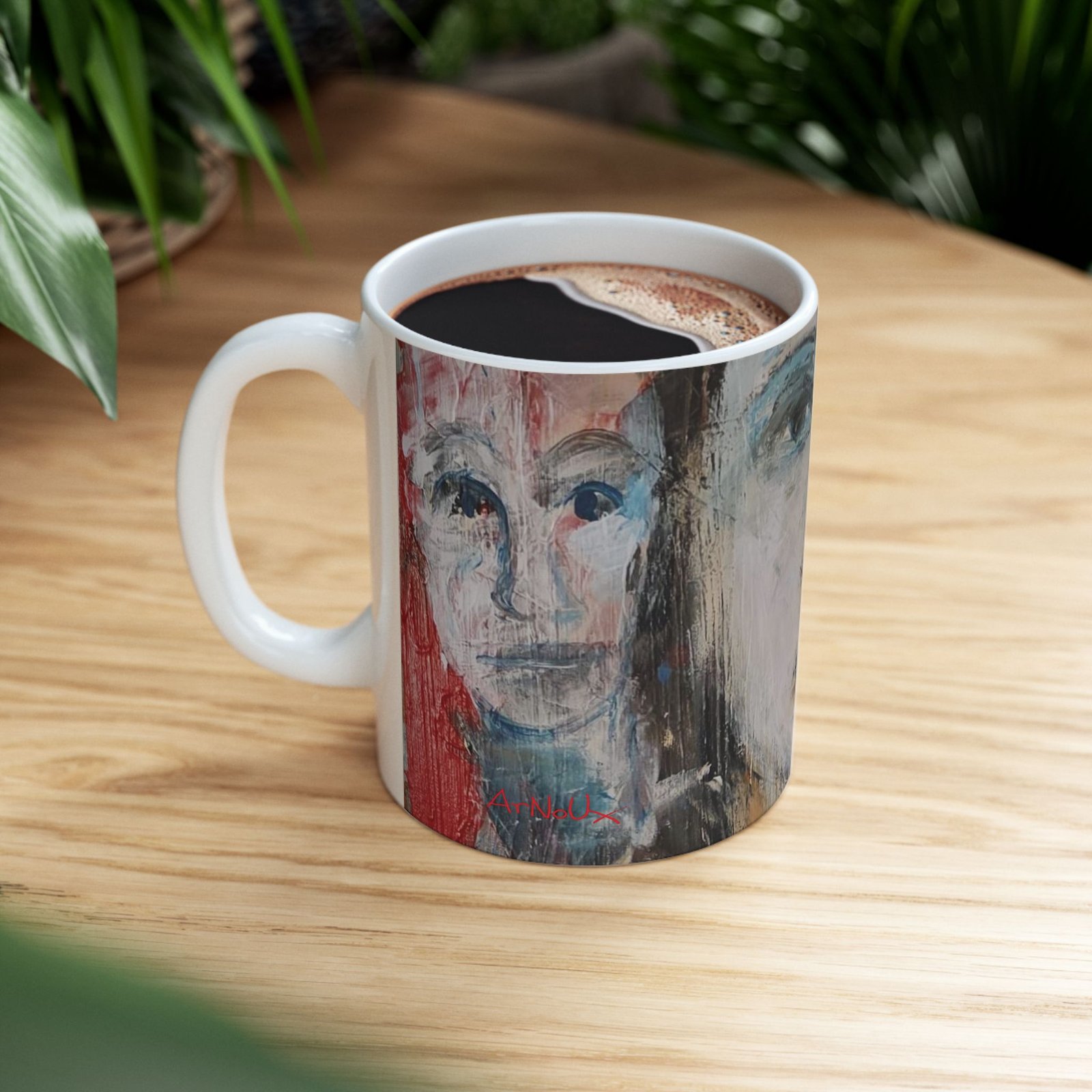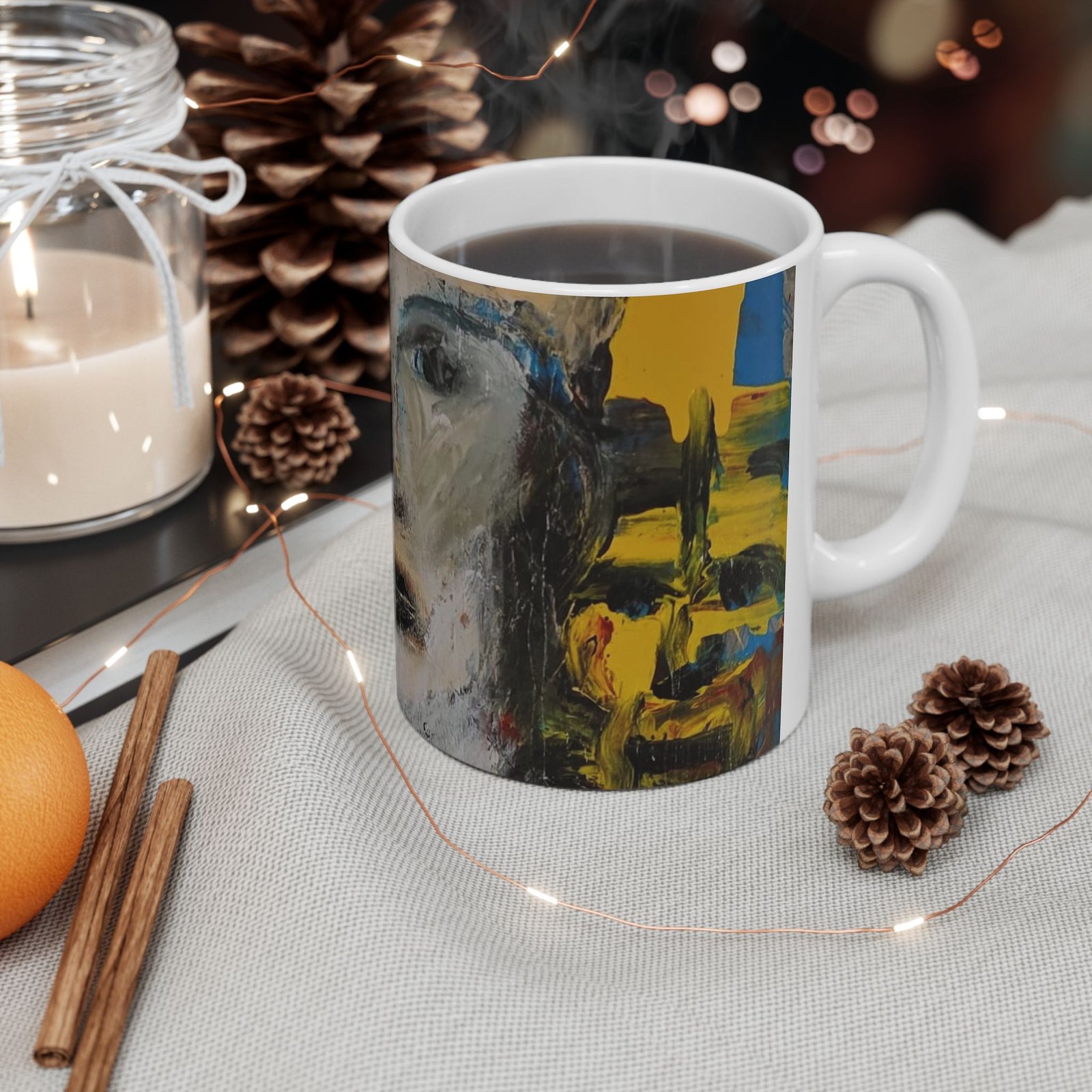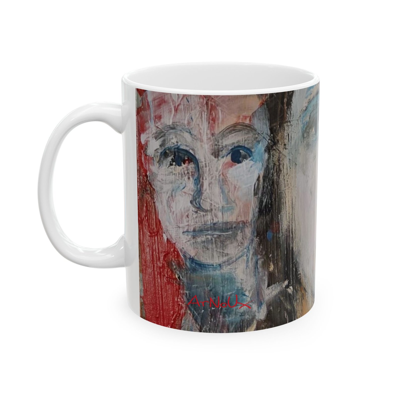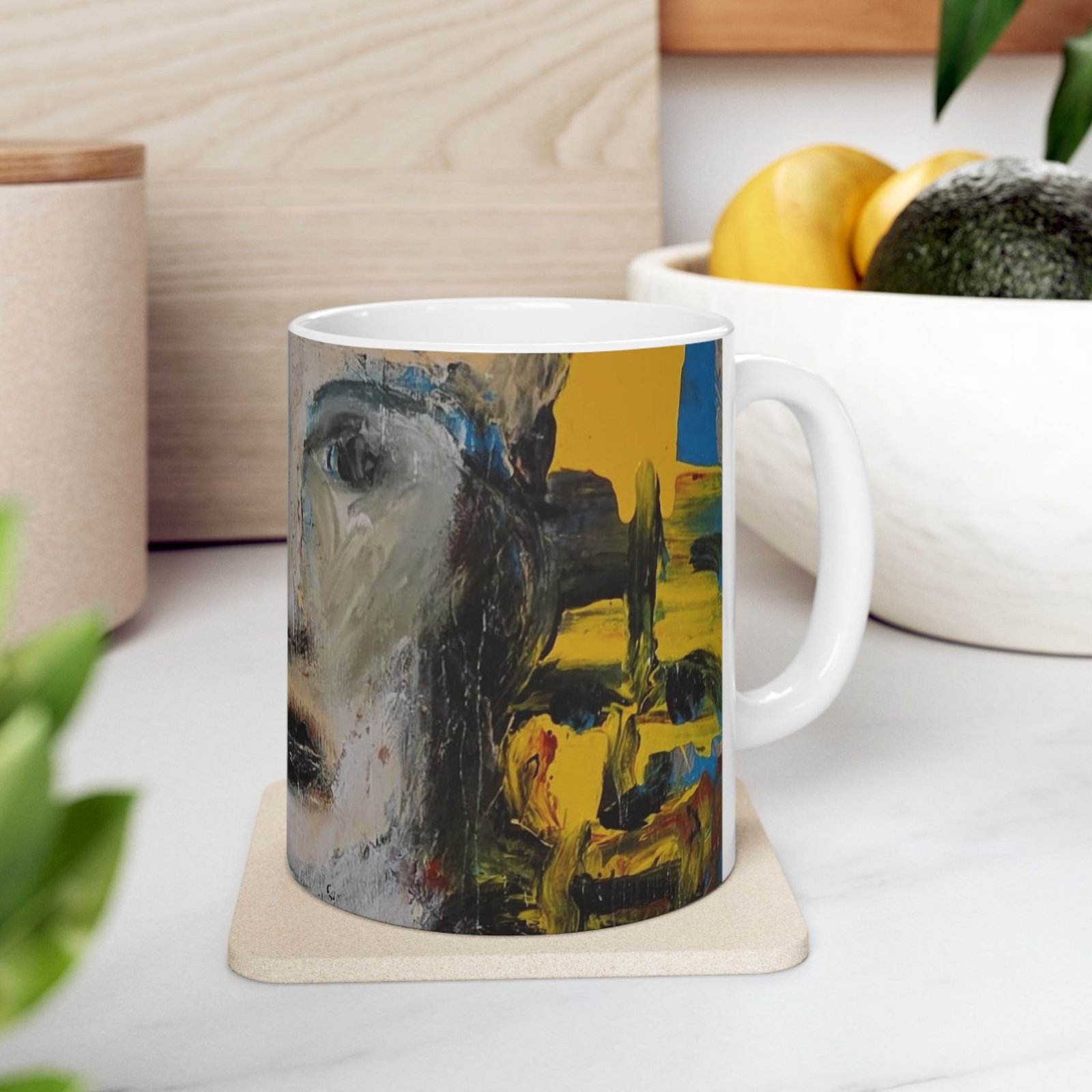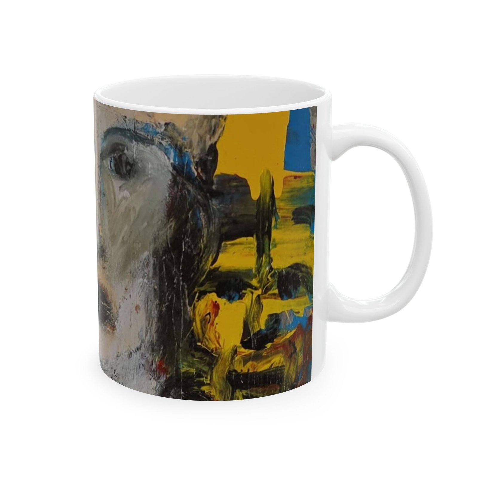 A glossy ceramic mug that carries a quietly bold art presence. Brushstrokes and muted faces wrap the curved surface, inviting slow mornings and thoughtful pauses. The slightly abstract portrait and energetic color panels feel like a mini gallery visit with every sip — warm coffee, cool tea, or a late-night cocoa. It sits comfortably in hand with a classic C-handle and a shiny finish that makes the printed artwork pop. Durable, safe, and vivid, this mug brings a calm, creative moment to everyday routines and shared breaks.