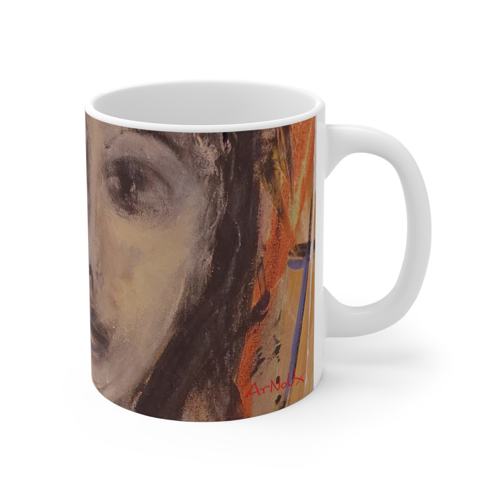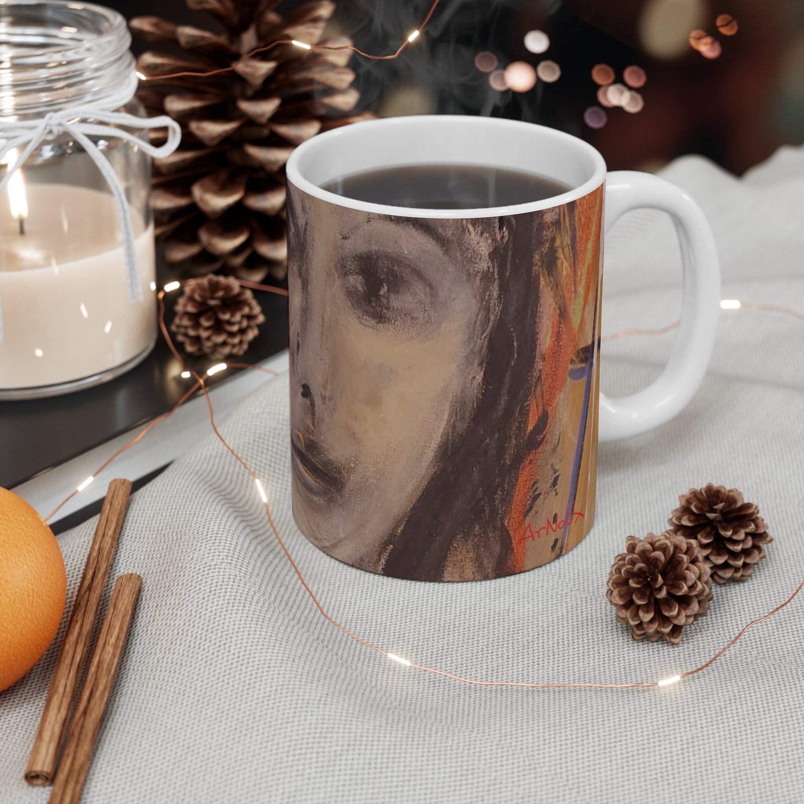 A small ceramic mug with a quietly intense aesthetic — a close-up portrait rendered in muted earth tones with a streak of neon green. It feels like a private sketch shared over morning coffee, an object that holds both utility and a subtle emotional charge. Warmth rises from the cup and the image, inviting a reflective moment before the day begins or a slow pause in the afternoon. The rounded C-handle fits the hand naturally, and the compact 11oz size keeps drinks at the right temperature while focusing attention on the artwork wrapped around the surface. This mug suits someone who prefers thoughtful, slightly enigmatic objects that spark conversation and introspection.