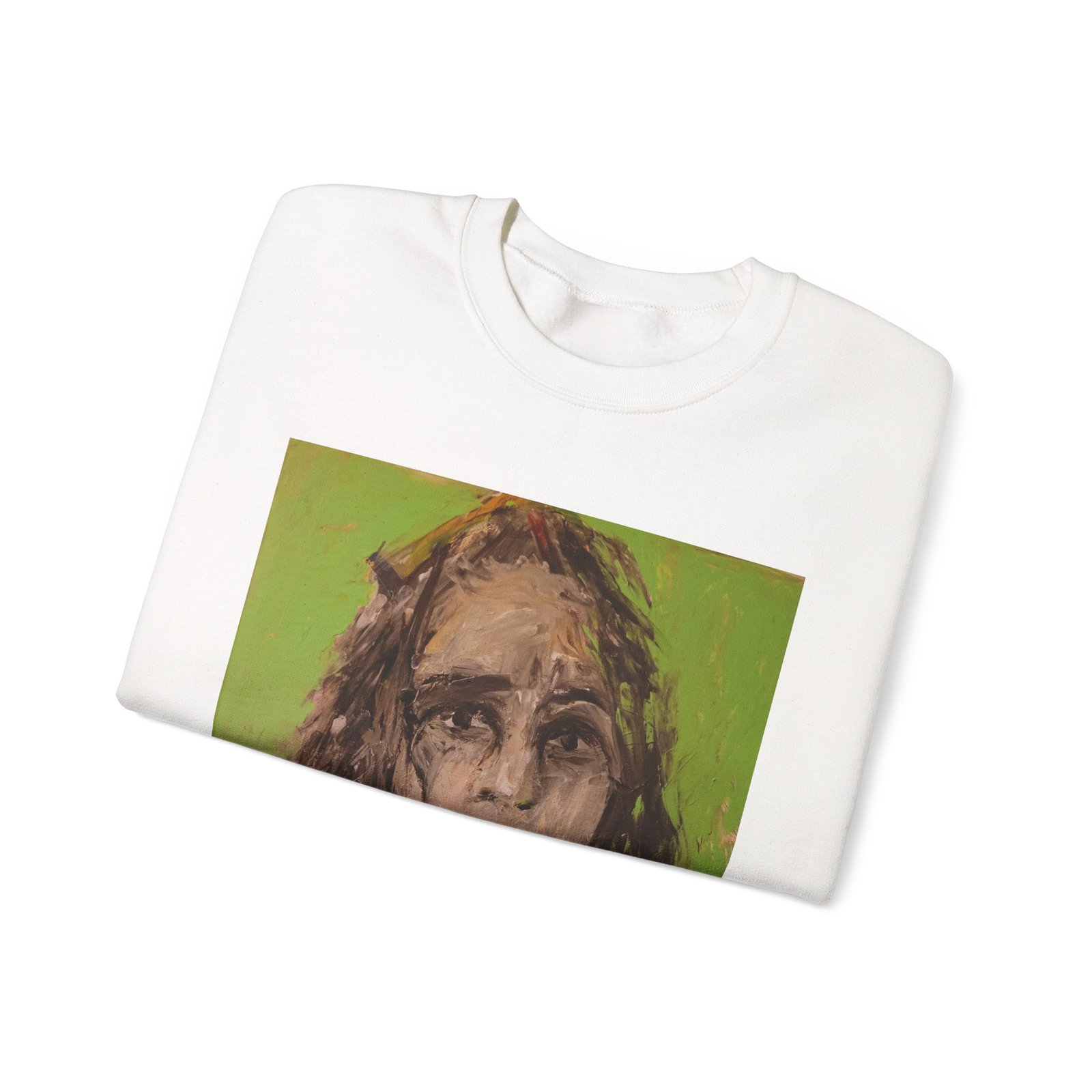 This cozy crewneck sweatshirt blends wearable comfort with raw, expressive art. A painterly portrait—soft-edged and emotionally charged—sits on the front, its muted earth tones warmed by a soft green background. Subtle, handwritten script appears on the back neckline and along the sleeves, adding a personal, studio-made touch. The relaxed silhouette and clean crew neckline make it an easy layer for slow mornings, gallery visits, or evenings curled up with a sketchbook. It feels like wearing a quiet conversation with an artist: thoughtful, a little melancholic, and wholly human.
