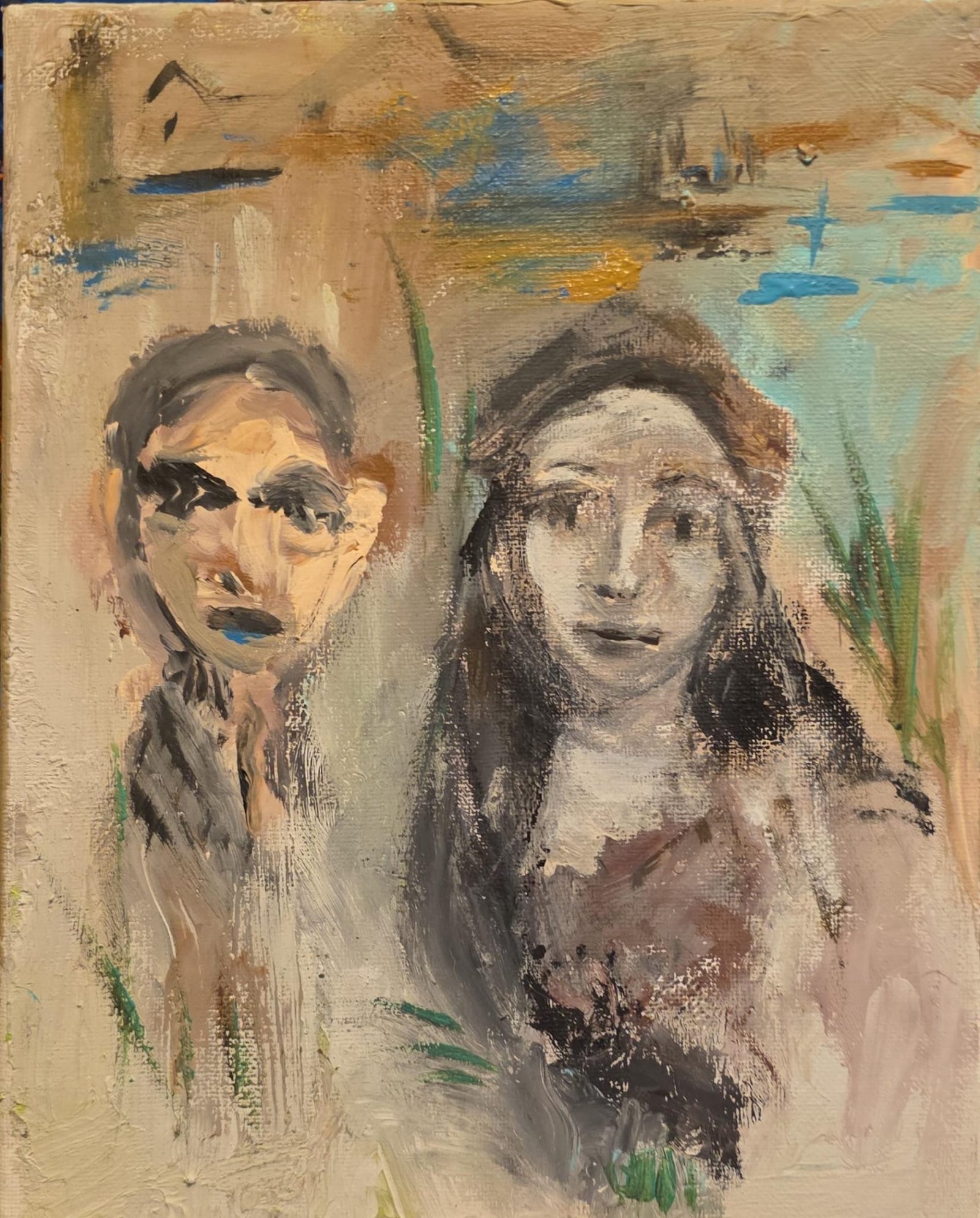 The surrounding palette—soft earth tones, grays, and subtle interruptions of color—creates an atmosphere of introspection and emotional ambiguity. The brushwork is loose, unfinished, allowing forms to dissolve into one another, reinforcing the idea of identity and feeling being intertwined and, at times, taken.