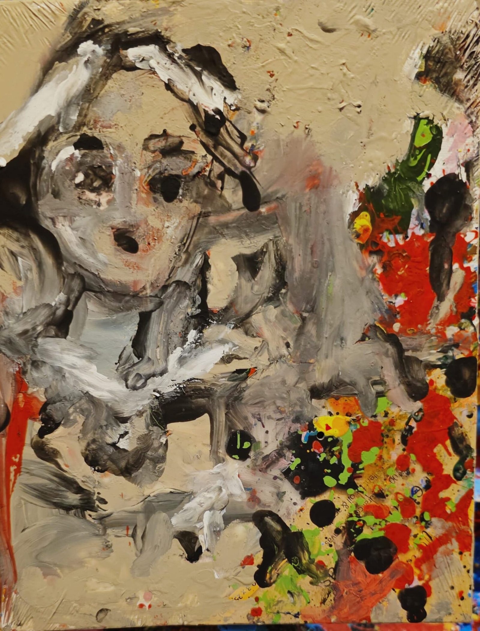 The angelic figures, loosely defined and partially dissolved into the surface, reject anatomical precision in favor of emotional intensity. They exist as transitional beings—neither fully visible nor entirely absent—inhabiting an abstract garden where matter itself seems to breathe. The gestural brushwork, combined with drips and dense pigment accumulations, reveals an intuitive and physical process aligned with expressionist automatism.