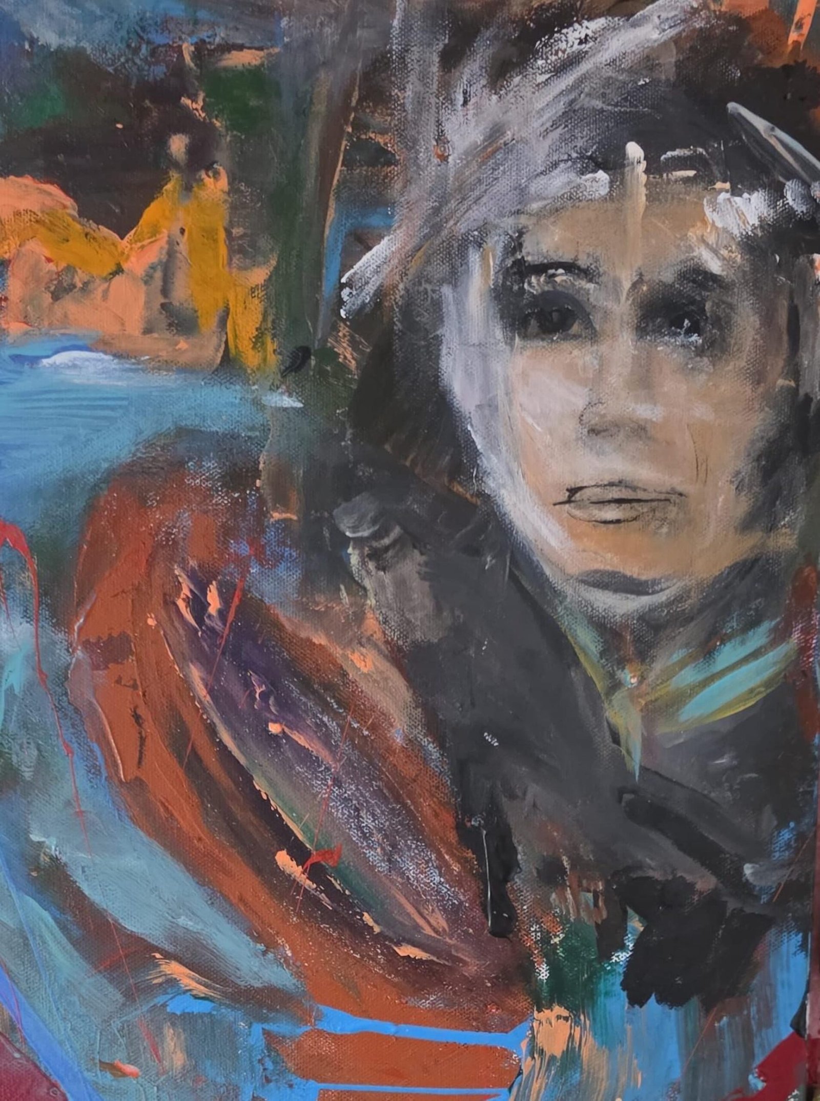 This small-format work depicts the guardian angel ofj sailors as a silent captain navigating unseen currents. The face emerges from turbulent layers of blue, earth tones, and dark washes, suggesting sea, weather, and memory intertwined. Rather than commanding a ship, the figure embodies vigilance and protection, guiding vessels through uncertainty and danger. The restrained scale intensifies its intimacy, inviting close contemplation. Rooted in German Expressionism, the painting prioritizes emotional truth over realism, presenting faith as navigation and presence as shelter for all who cross the waters.