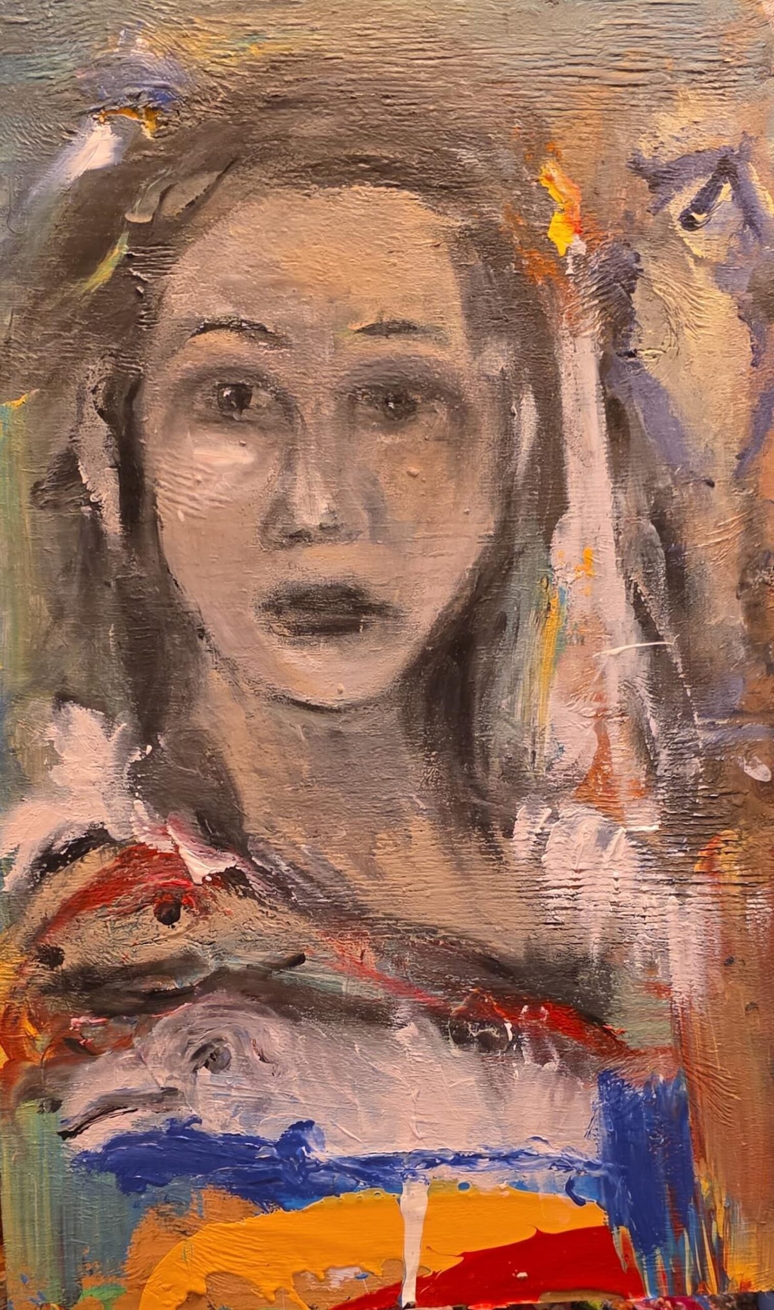 Executed on wood panel, the material reinforces the rawness and immediacy of the act—unpolished, direct, and unrepentant. The work does not seek to narrate, but to expose: the quiet horror of betrayal masked as affection.