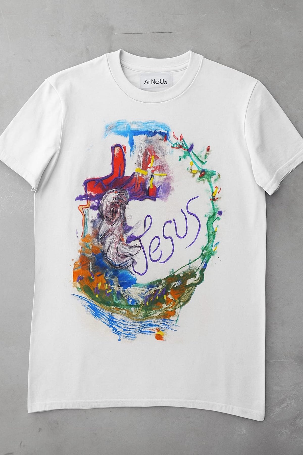 This wearable artwork embodies the profound reverence and energy of Jesus of Nazareth, expressed through vibrant brushstrokes that merge the cross, the Holy Spirit as a dove, and the power of the sacred name “Jesus.”