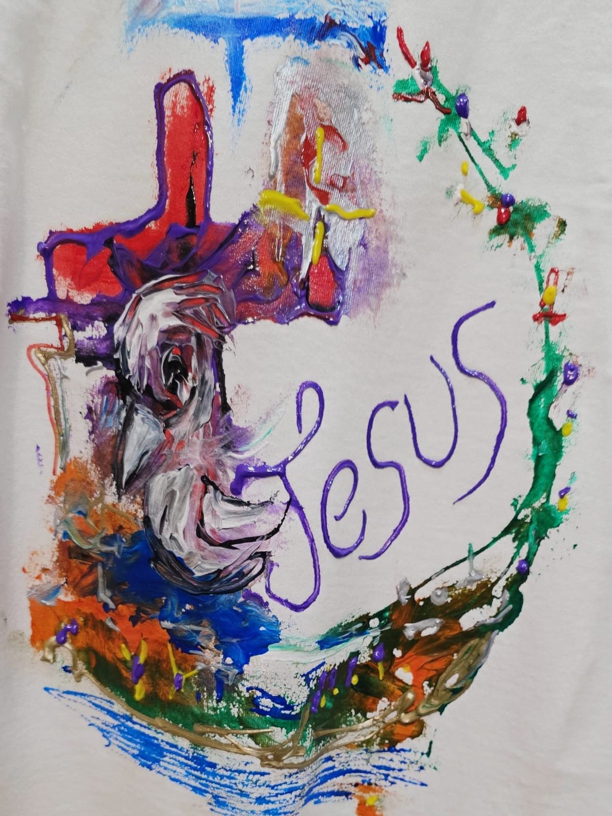 The artist invites the viewer not only to see but to wear faith, to carry the image of salvation as a living testimony. The paint rises from the fabric like a heartbeat of worship, blending the spiritual with the tactile—art on fabric, art on faith.