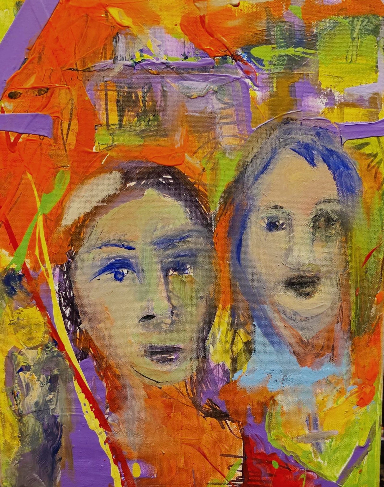 Two angelic figures emerge with softened yet expressive features, reflecting an emotional universality that transcends geography. The chromatic field—intense reds, oranges, violets, and fragments of green—creates a tension between inner stillness and external chaos, suggesting a space where tradition, identity, and spiritual revelation converge.
