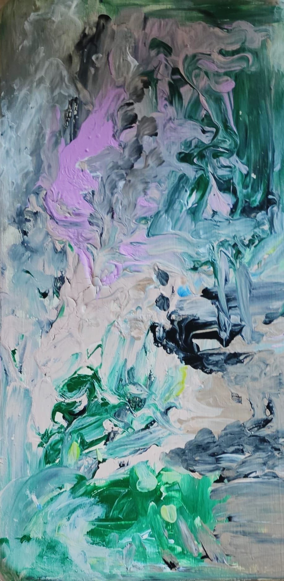 This artwork is created directly on a wooden bench, transforming an everyday object into a living canvas. Through thick textures and expressive strokes of green, black, mauve, and soft rose, the piece carries the raw physicality and emotional depth that define ArNoUx’s German Expressionist language.