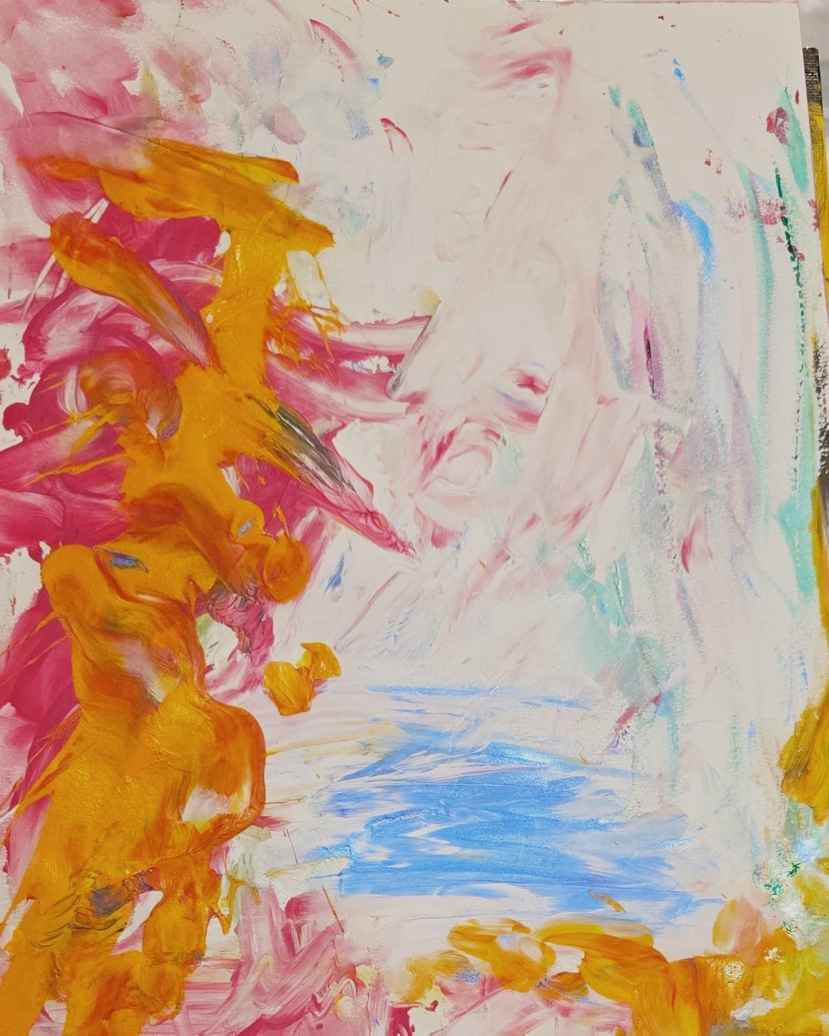 The pinks, whites, and pale strokes evoke drifting frost, frozen breath, and the stillness of a winter morning.