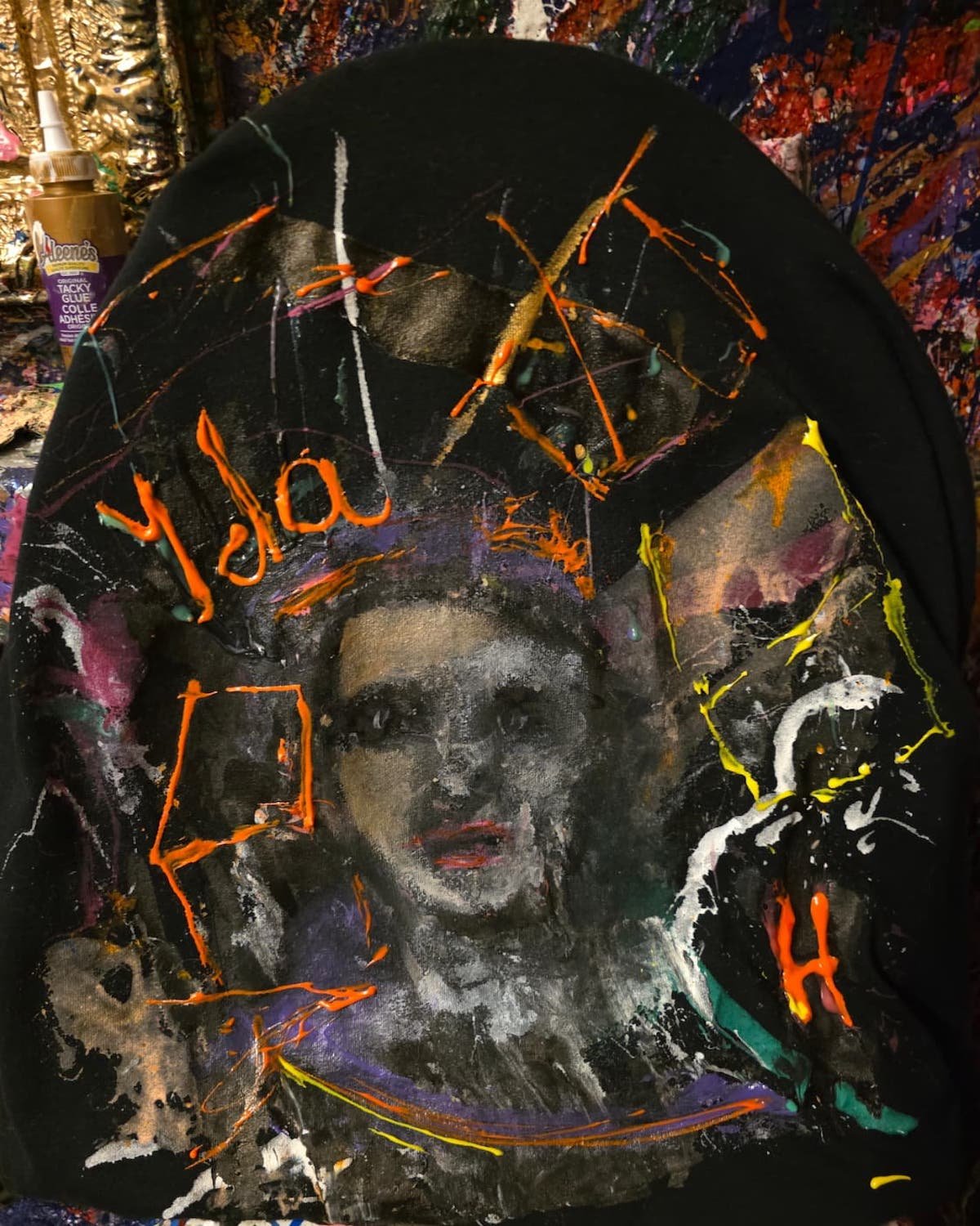 Medium: Acrylic on black cotton fabric (hand-painted T-shirt)